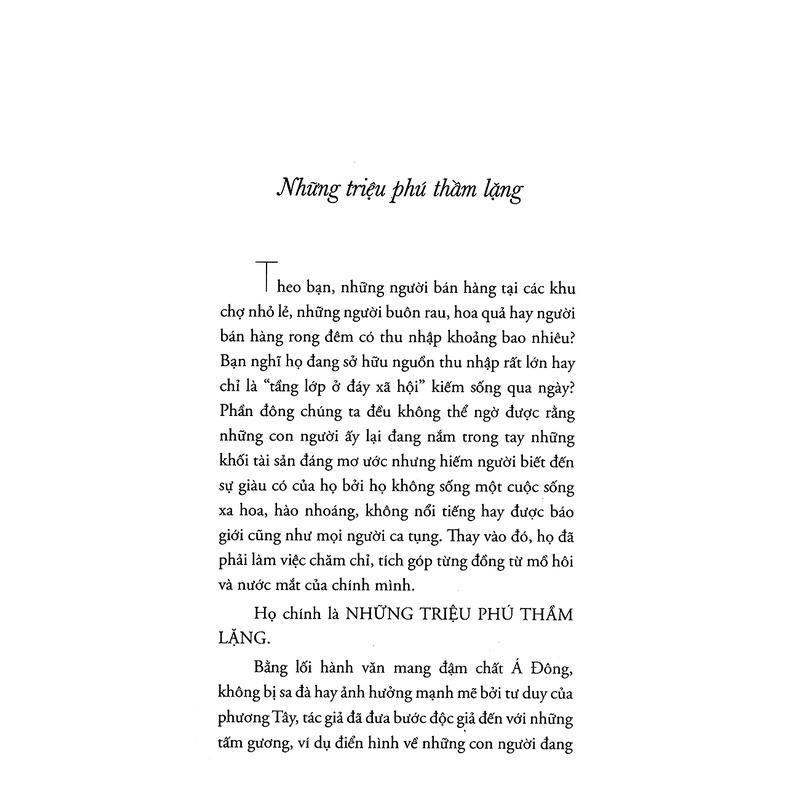 Những triệu phú thầm lặng luôn tồn tại giữa chúng ta. Họ hầu như không tạo ra dư luận, tranh cãi hay khiêu khích bởi họ gặt hái được thành công là nhờ "hai bàn tay lao động". Họ là "chủ nhân" của những quán ăn đường phố, những gánh hàng rong hay những sạp hàng tại các khu chợ đêm - vốn được coi là một phần trong nét văn hóa đặc trưng của các nước Đông Nam Á như malaysia hay Việt Nam.