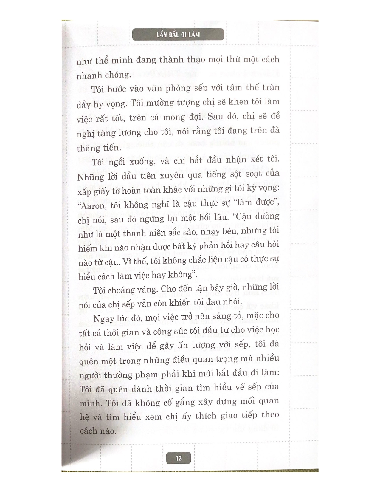 Lần Đầu Đi Làm-Vanlangbooks I.Giới thiệu sách Trường đại học KHÔNG dạy bạn cách thành công trong thế giới công việc. Không có bất kỳ khóa học hay giáo trình nào hướng dẫn cách xây dựng một sự nghiệp thành công mà nhiều người khao khát. "Lần Đầu Đi Làm" sẽ giúp bạn lấp đầy lỗ hổng kiến thức đó. Sách đưa ra những lời khuyên phù hợp cho bạn trẻ – những chuyên gia trẻ – đang tìm cách gầy dựng nền tảng vững chắc cho sự nghiệp. Sách sẽ cung cấp cho bạn: