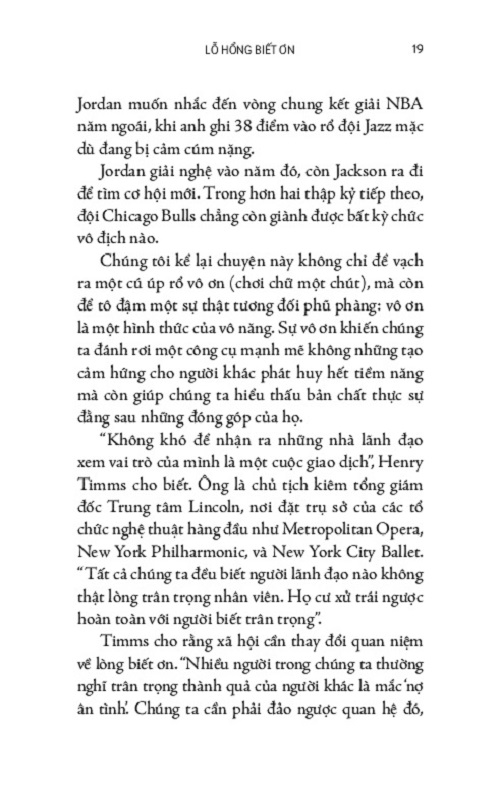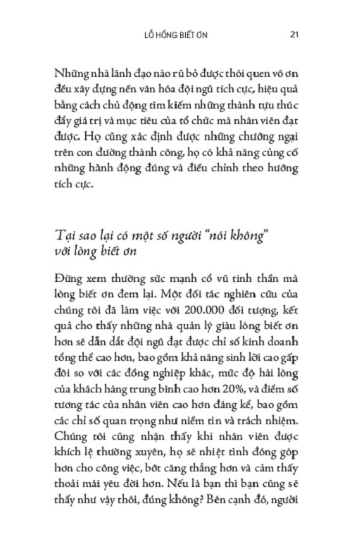 Người lao động muốn biết và cần biết công việc của mình có được trân trọng hay không. Bày tỏ lòng biết ơn đúng cách với nhân viên là phương thức đơn giản nhất, nhanh nhất, cũng như ít tốn kém nhất để tăng cường hiệu quả làm việc và giữ chân nhân viên lâu dài. Nhưng bằng cách nào, ngoài tiền thưởng và lời khen đôi khi có vẻ sao rỗng? "Lãnh Đạo Bằng Lòng Biết Ơn" sẽ gợi ý cho bạn. Quyển sách này đi sâu bàn luận một yếu tố tâm lý trong quản trị là lòng biết ơn và đưa ra những các thức đơn giản và thiết thực để phát huy yếu tố đó trong môi trường công sở hằng ngày nhằm thúc đẩy tinh thần, hiệu quả và lợi nhuận. Với giọng văn dễ hiểu, nhẹ nhàng và những ví dụ thiết thực, sau mỗi phần thực hành đều có phần tóm tắt để độc giả dễ nhớ và dễ theo dõi, quyển sách sẽ dẫn bạn qua từng phần, từ những hiểu lầm về cách thể hiện lòng biết ơn nơi công sở, đến những cách thức để áp dụng lòng biết ơn đến cách thể hiện lòng biết ơn cả trong đời sống cá nhân lẫn môi trường công sở.