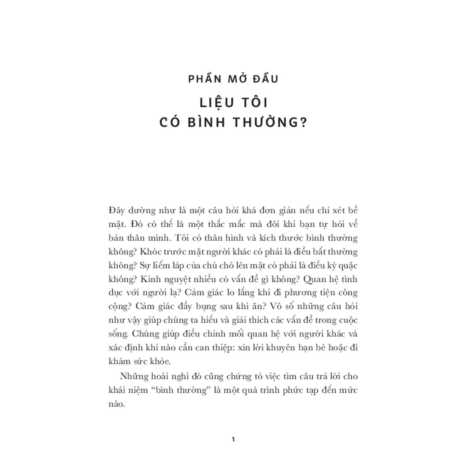 Các vấn đề đặt ra trong sách đều thú vị, đi từ giải thích thuật ngữ "bình thường" từ cổ chí kim đến các băn khoăn liệu cơ thể mình có bình thường? Tâm trí, đời sống tình dục, cảm xúc... của mình có bình thường chăng? Con của mình có bình thường, có giống hay bằng “con nhà người ta” không? Cả xã hội này có bình thường?