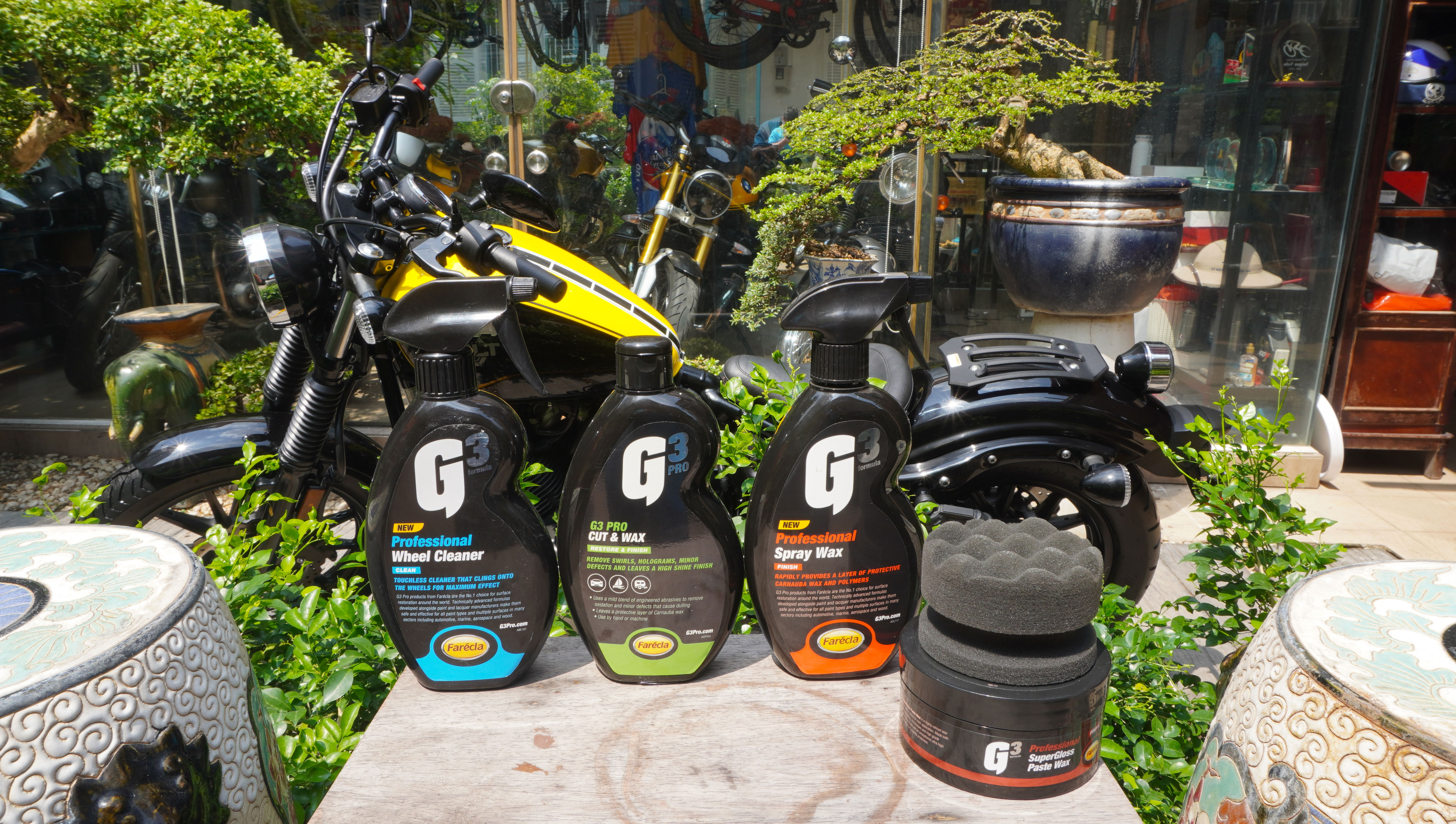 G3 Pro Cut & Wax với chất đánh bóng có tính mài mòn nhẹ được sử dụng để loại bỏ các khuyết điểm bề mặt như vết xoáy, hình ba chiều và quá trình oxy hóa để lại một lớp sáp Carnauba mỏng, bảo vệ và cho độ bóng cao. Đây là sản phẩm có 2 công dụng: xóa khuyết điểm và đánh bóng, bảo vệ bề mặt sơn. HƯỚNG DẪN 1 - Đảm bảo bề mặt sạch sẽ, khô ráo và thoáng mát. 2 - Sử dụng một ít dung dịch lên bề mặt sơn cần xử lý hoặc lên khăn. 3 - Dùng khăn chà nhẹ lên bề mặt cần xử lý với thao tác qua lại, lên xuống. 4 - Khi các vết trầy xước bị loại bỏ, đợi tới khi dung dịch còn sót lại tạo thành lớp màng khô mỏng. 5 - Sau đó đánh bóng bằng vải sạch, khô, mịn giúp bề mặt bóng sáng trở lại. LƯU Ý: Có thể đánh bóng bằng tay hoặc máy.
