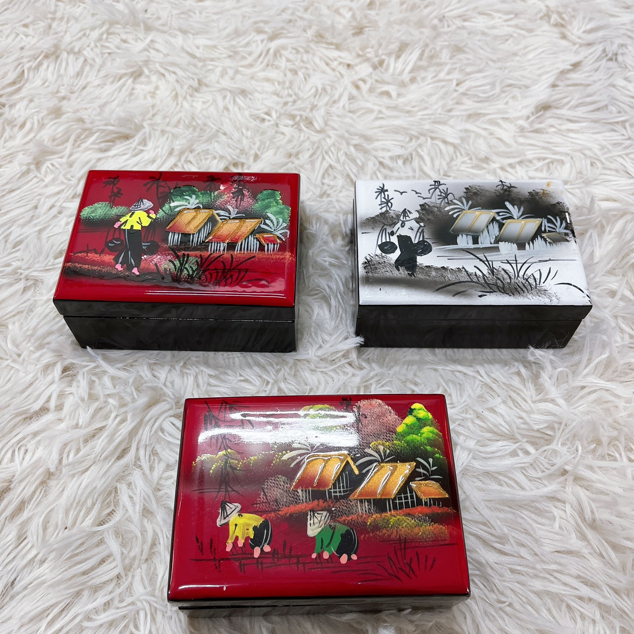 LƯU Ý: Shop giao mẫu ngẫu nhiên, khách hàng muốn lựa chọn mẫu vui lòng nhắn tin riêng cho shop nhé ạ. HỘP ĐỰNG NỮ TRANG SƠN MÀI HÌNH CHỮ NHẬT Vỏ gỗ sơn mài vẽ tay thủ công tinh tế, nội thất bọc vải nhung đỏ sang trọng, thiết kế trang nhã, trẻ trung, thanh lịch ✪ Kích thước: 8x11x5cm ✪ Có gương phía trong để kết hợp trang điểm Hàng Việt Nam xuất nhập khẩu HÀNG CHUẨN CHẤT LƯỢNG ẢNH SHOP TỰ CHỤP, SẢN PHẨM NGOÀI ĐẸP HƠN. Luôn có nhiều ưu đãi cho Khách hàng mới và Khách hàng thân thiết Cam kết hàng giao đúng mẫu đăng trên gian hàng Sản phẩm có sẵn, thời gian gửi hàng nhanh chóng tới đơn vị vận chuyển CÓ ĐỊA CHỈ TRỰC TIẾP ĐỂ CÁC BẠN TỚI LỰA CHỌN THỎA THÍCH Uy tín - chất lượng luôn được đặt lên hàng đầu.