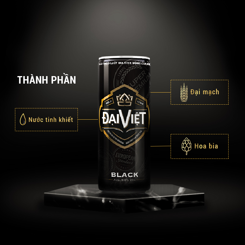 ĐẠI VIỆT BLACK – Bia Đen dành cho người Việt có "Gu" Sử dụng công nghệ sản xuất bia tinh dòng của Xứ Beyer miền Tây nước Phổ (nay là CHLB Đức) kết hợp với