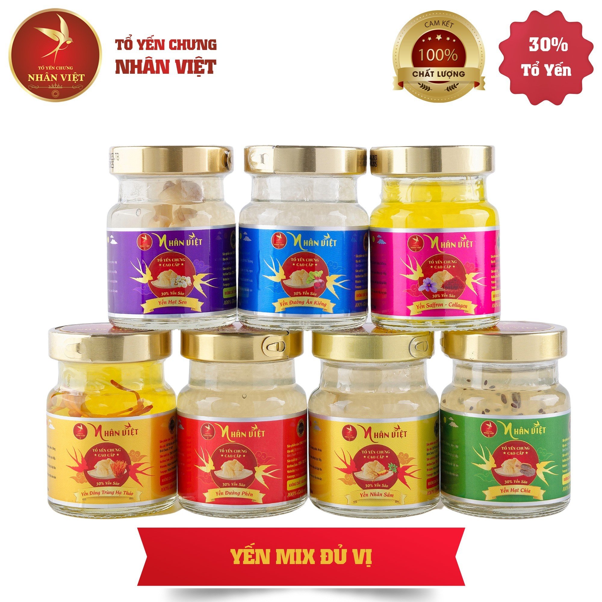 - Thể tích thực : 70ml x 6 hũ mix vị các loại (hạt sen, hạt chia, nhân sâm, đông trùng hạ thảo, saffron collagen) Các dòng sản phẩm của Yến hũ chưng sẵn Nhân Việt (30% tổ yến):