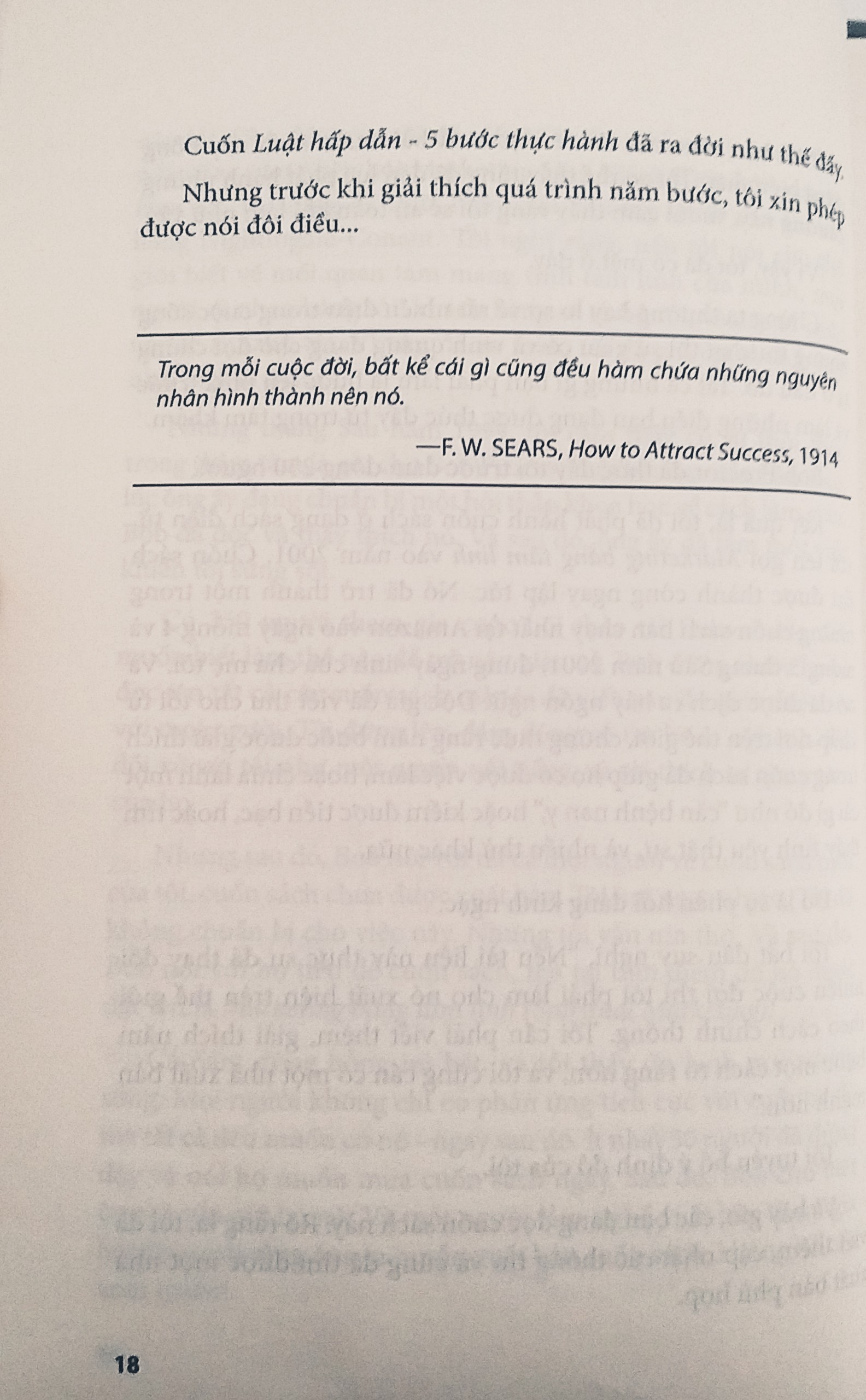 Mọi người đều mong muốn khám phá ra những bí mật của thành công, đạt tới tình trạng hoàn toàn mãn nguyện và tìm ra con đường để hoàn thiện bản thân. Thông qua cuốn Luật hấp dẫn – 5 bước thực hành, Joe Vitale sẽ chỉ cho chúng ta thấy làm thế nào để thực hiện được điều này. Bí quyết đó chính là năm bước không thể thất bại mà bạn sẽ được khám phá trong cuốn sách này. Hãy cùng tôi theo sau Joe Vitale để ổng dẫn dắt chúng ta vào cuộc hành trình tự khám phá, và nó sẽ làm cho cuộc sống của chúng ta thay đổi mãi mãi. (Trích lời giới thiệu của Tiến sĩ Robert Anthony). “Nói tóm lại, bí quyết để công việc làm ăn của bạn có sự tăng trưởng, tìm thấy tình yêu, có sức khỏe tốt hơn, hoặc đạt được bất cứ điều gì bạn muốn là: