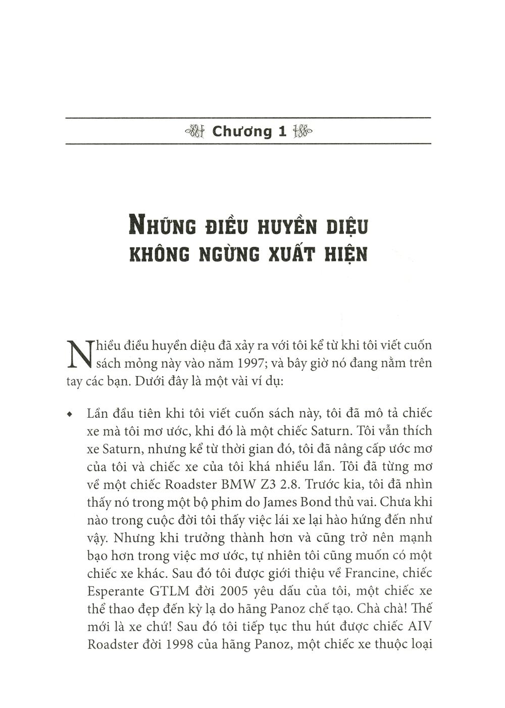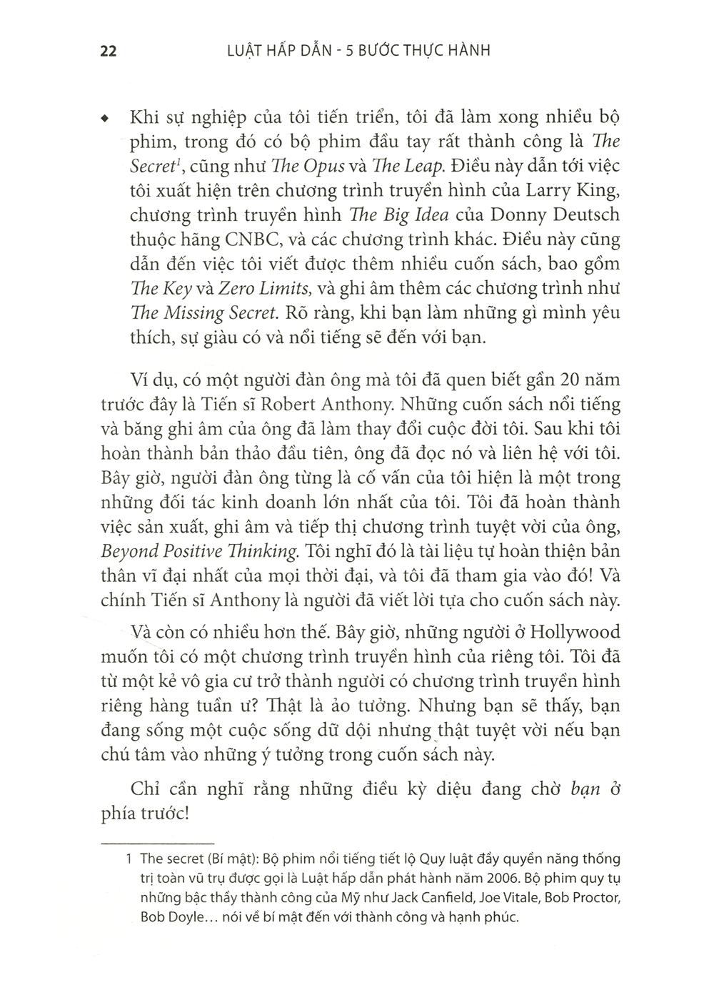 Rất nhiều người cứ loay hoay tìm cách. Tôi ngày xưa cũng vậy. May thay, sau khi đọc xong cuốn Người nam châm – bí mật của luật hấp dẫn, tôi đã đọc ngay cuốn Luật hấp dẫn – 5 bước thực hành và nói thật hai cuốn sách này đã làm thay đổi tôi hoàn toàn. Vậy nên trong lần tái bản này tôi không thể không viết vài dòng về cuốn sách.