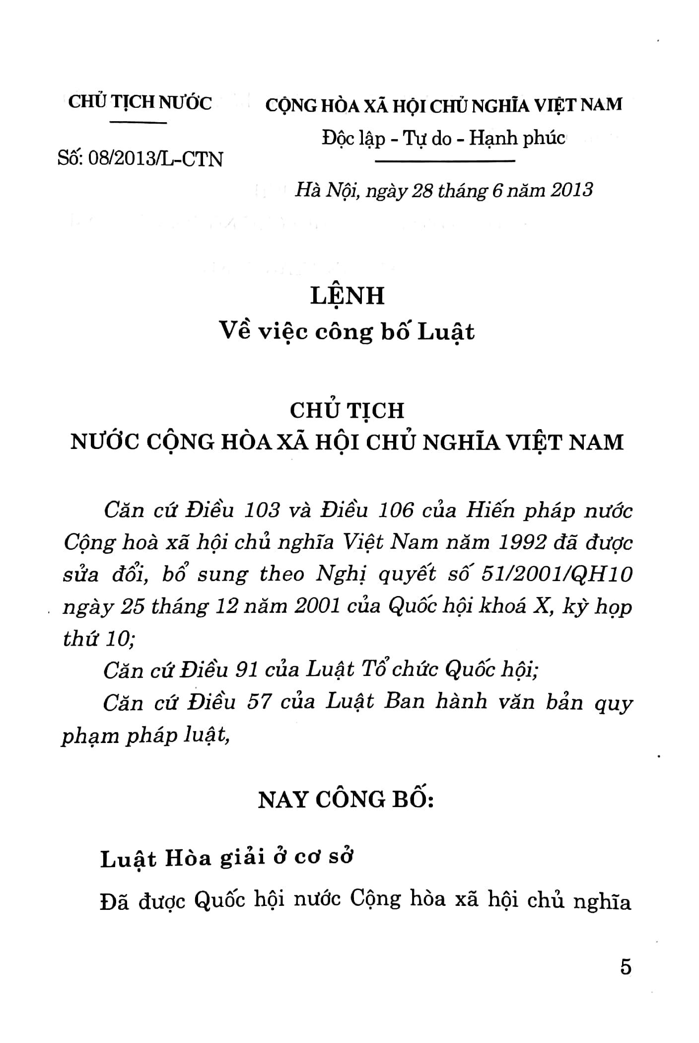 Luật Hòa Giải Ở Cơ Sở (Hiện Hành) Luật Hòa giải ở cơ sở (hiện hành) được Quốc hội nước Cộng hòa xã hội chủ nghĩa Việt Nam khóa XIII, kỳ họp thứ 5 thông