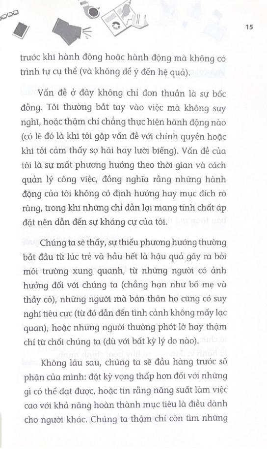 Thế giới này đầy rẫy những người tài giỏi với nhiều năng lực, ý tưởng và khát vọng, nhưng họ lại luôn gặp trở ngại, rào cản trên con đường hiện thực hóa mục tiêu của mình. Dù thái độ bên ngoài và hành động có sự tổ chức tốt cùng quyết tâm mạnh mẽ lúc đầu, nhưng không ít người cảm thấy lúng túng vì không biết cách hoàn thành công việc, tư duy thất thường luôn khiến sự tiến bộ của họ bị ngắt quãng, năng suất làm việc bị ảnh hưởng nghiêm trọng.