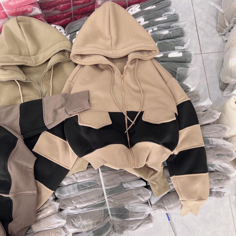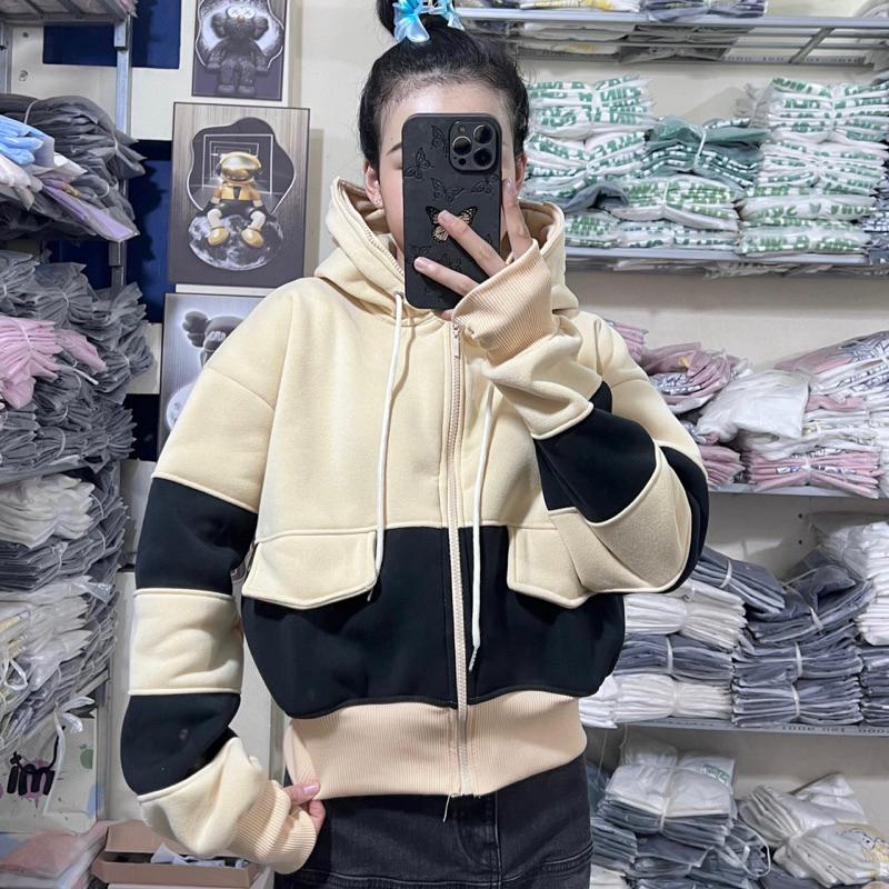✨[LZ] Áo khoác Kéo Cao Nỉ Dày Chống Nắng Dáng Lửng Phối Màu Tay Xỏ Ngón 4 Túi Nón To hàng đẹp xitin-A2165