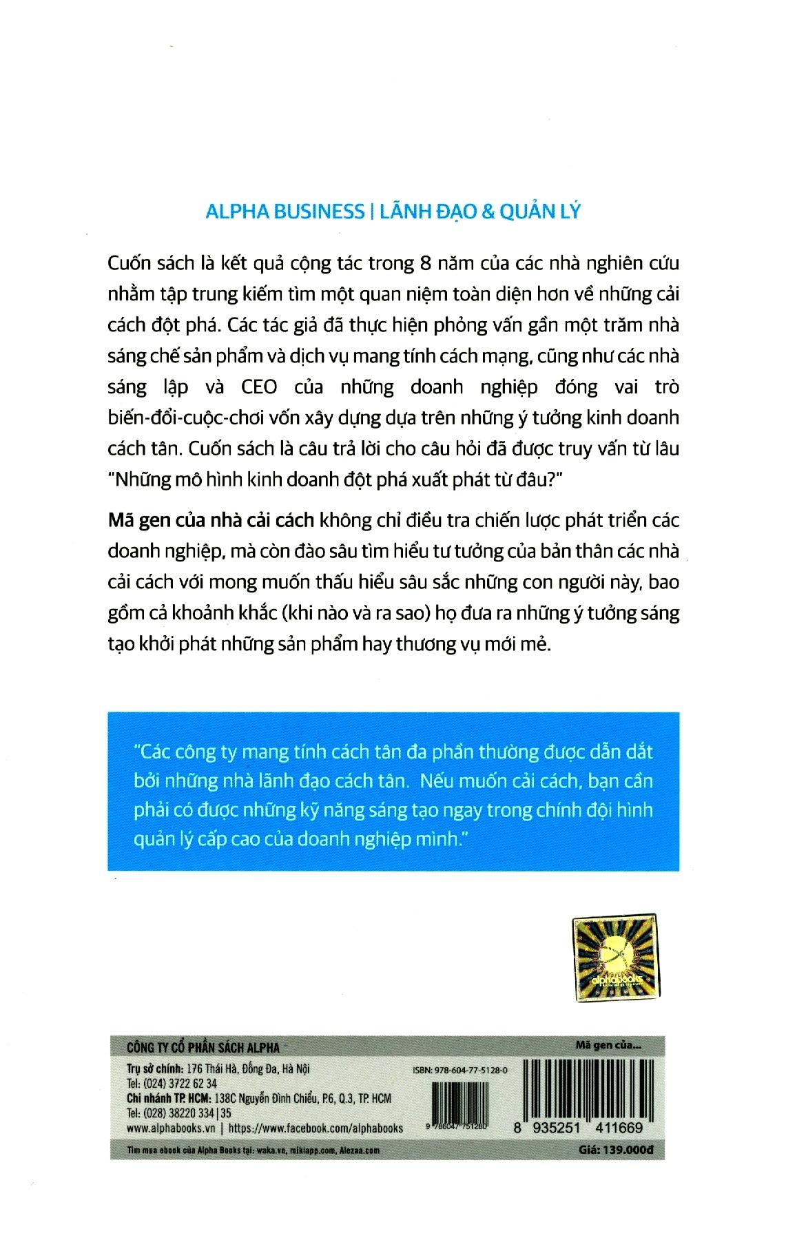 Mã gen của nhà cải cách thảo luận chính những câu hỏi căn cốt này – và còn hơn thế nữa. Là kết quả của một công trình nghiên cứu kéo dài suốt tám năm trời của nhiều tác giả, trong đó mọi người cùng nhau kiếm tìm một quan niệm toàn diện hơn về các nhà cải cách đột phá – họ là ai và những doanh nghiệp cách tân mà họ sáng tạo nên là gì, cuốn sách sẽ hé mở nguồn gốc của những ý tưởng kinh doanh cách tân – và thường là, mang tính đột phá. phỏng vấn gần một trăm nhà sáng chế các sản phẩm và dịch vụ mang tính cách mạng, cũng như các nhà sáng lập và CEO của những doanh nghiệp đóng vai trò biến-đổi-cuộc-chơi vốn xây dựng dựa trên những ý tưởng kinh doanh cách tân. Mục tiêu của cuốn sách không nhằm vào việc điều tra chiến lược các doanh nghiệp, mà hơn thế, là đào sâu tìm hiểu tư tưởng của bản thân các nhà cải cách với mong muốn thấu hiểu tối đa những con người này, bao gồm trong đó cả khoảng khắc (khi nào và ra sao) họ đưa ra những ý tưởng khởi phát những sản phẩm hay doanh vụ mới mẻ.
