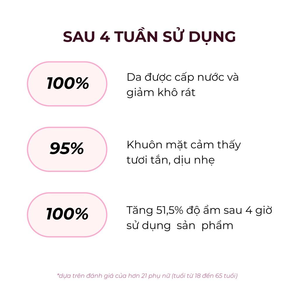 ĐỐI TƯỢNG: Dùng cho mọi loại da, chủ yếu dành cho da mất nước TÁC ĐỘNG SINH HỌC: ĐỘ AN TOÀN: Không gây kích ứng Không chứa paraben Không chứa xà phòng Dùng được cho