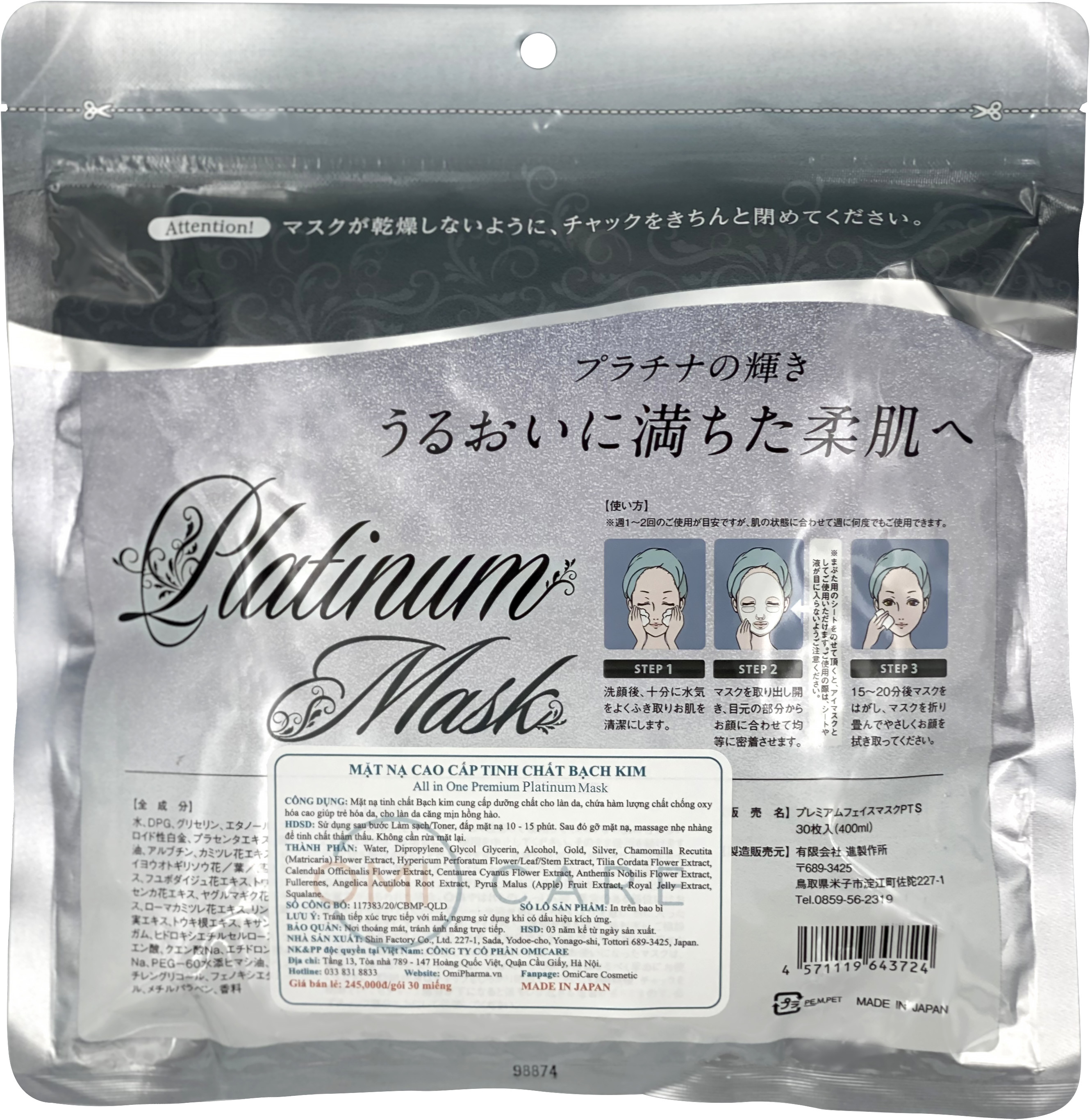 Bên cạnh đó, mặt nạ All in One Premium Platinum còn chứa dầu ngựa Arbutin và 8 loại tinh chất từ thảo dược - những nguyên liệu làm đẹp thân thiện, điều hòa da nổi tiếng của Nhật Bản giúp da sáng hồng, mịn màng.