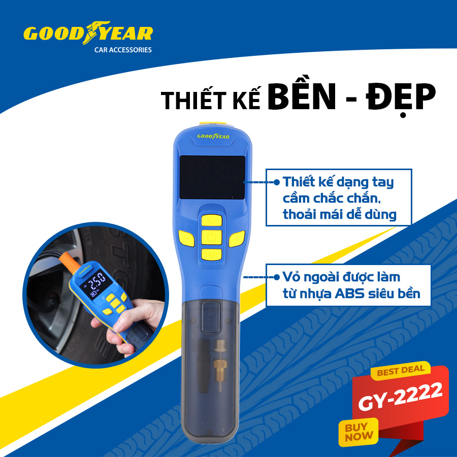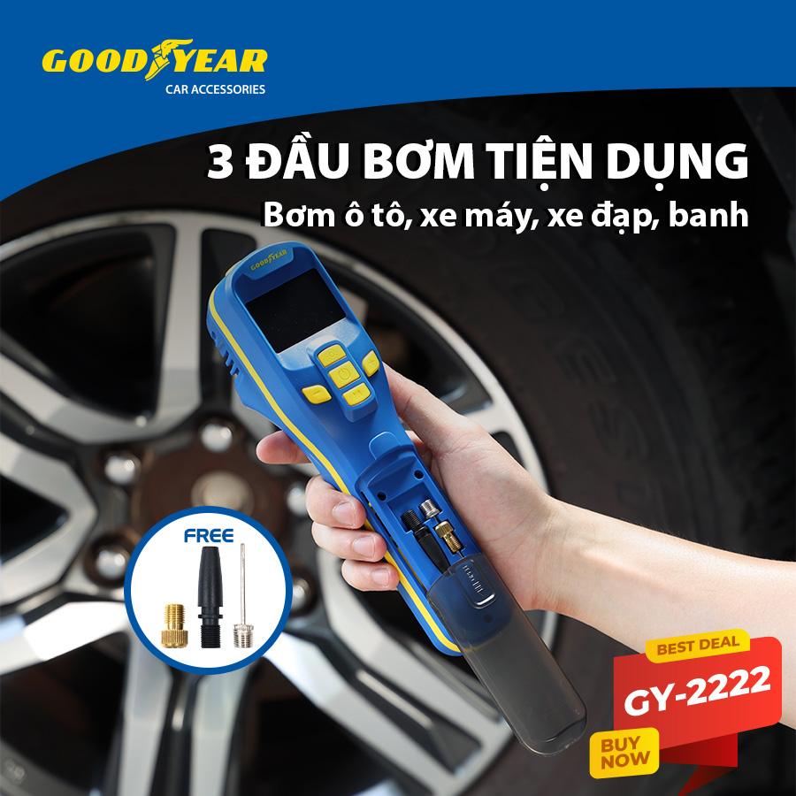 SHOP CIND XIN CHÀO QUÝ KHÁCH, CẢM ƠN QUÝ KHÁCH ĐÃ QUAN TÂM SẢN PHẨM CỦA SHOP CIND  MÔ TẢ SẢN PHẨM Máy Bơm Lốp Xe GOODYEAR GY-2222 Cầm Tay Nhỏ Gọn Không Dây Tích Điện   Đặc điểm nổi bật: Máy bơm hơi chính hãng thương hiệu nổi tiếng Goodyear Bơm ô tô TỰ ĐỘNG NGẮT khi áp suất lốp đạt đến giá trị tiêu chuẩn Có thể chuyển đổi giữa các đơn vị chỉ số đo: Psi, Bar, Kpa, Kg/cm2 Thiết kế cầm tay nhỏ gọn, sử dụng pin sạc, không dây điện, gọn nhẹ và di động, được trang bị túi vải đựng chuyên dụng Sử dụng Pin Lithium bền bỉ dung lượng lên đến 2600 mAh Với bốn chế độ cài đặt áp suất có thể lập trình trước, sẵn sàng bơm hơi lốp xe đạp, xe máy và ô tô cũng như một quả bóng thể thao hay phao hơi... Tích hợp 3 chế độ đèn: đèn pin, đèn cảnh báo, đèn sos Sản phẩm có 3 đầu bơm khác nhau   Thông số kỹ thuật: Model: GY-2222