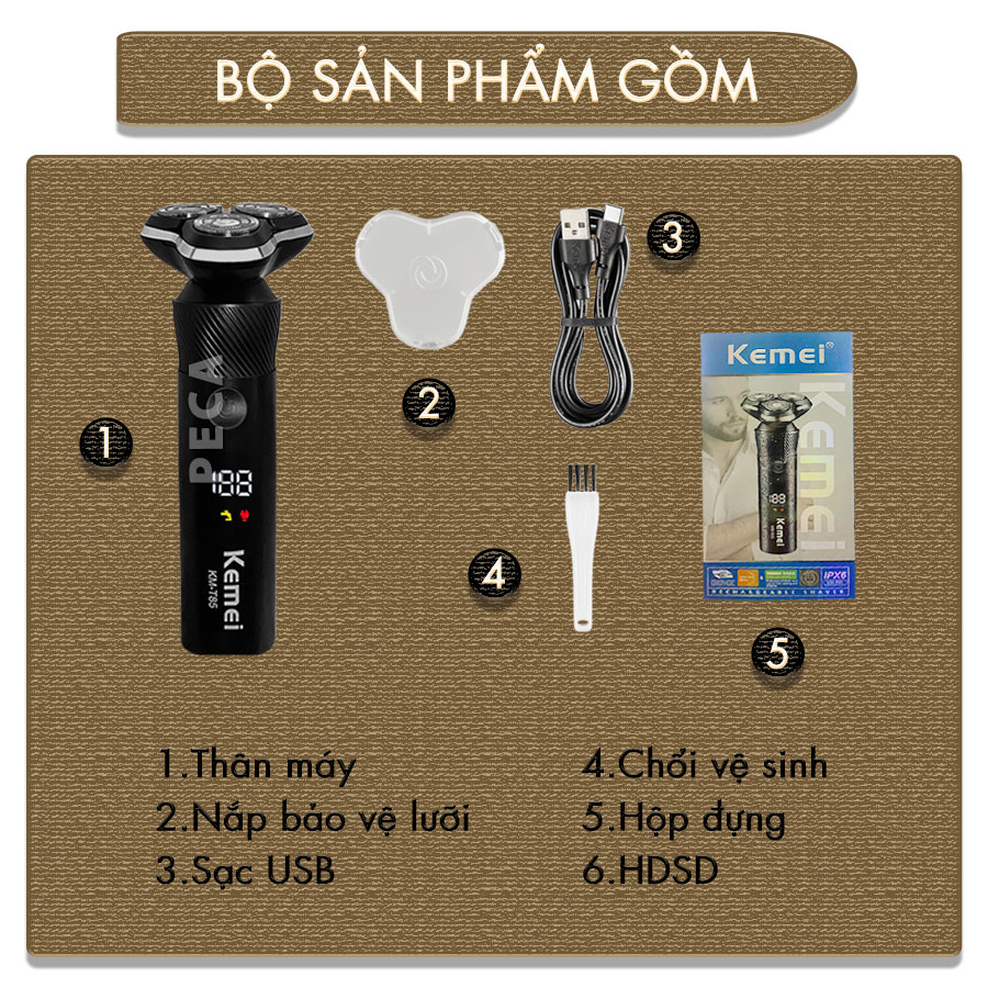 Cạo Ướt: Máy cũng hỗ trợ cạo ướt khi sử dụng cùng bọt cạo râu hoặc gel. Tính năng này đặc biệt hữu ích cho những người có làn da nhạy cảm, giúp giảm thiểu kích ứng và mang lại cảm giác thoải mái.   7/ Màn hình LCD tiện lợi Máy cạo râu Kemei KM-T85 được trang bị màn hình LCD hiện đại, cung cấp thông tin cần thiết cho người dùng và tăng cường trải nghiệm sử dụng: Hiển thị phần trăm pin, vệ sinh, cảnh báo sạc.   Bộ sản phẩm bao gồm: Thân máy, Nắp đậy, Sạc USB, Chổi vệ sinh, HDSD, Hộp đựng   Thông số kỹ thuật máy cạo râu Kemei KM-T85: Thương hiệu Kemei Model KM-T85 Chất liệu ABS Công suất 8W Điện áp 5V Dung lượng pin 600mAh Thời gian sạc 1.5 Giờ Thời gian sử dụng 80 phút Phương pháp sạc USB Trọng lượng Khoảng 200g Kích thước sản phẩm 4 x 16 cm Màu sắc Đen Bộ sản phẩm bao gồm 1x thân máy,1x sạc USB, 1x chổi vệ sinh, 1x nắp đậy 1x hộp đựng