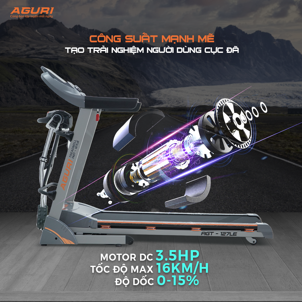 ✨Máy chạy bộ tại nhà AGURI AGT-127LE đa năng, đa tiện ích, motor DC 3.5HP, tải trọng 130kg, tốc độ lên tới 16km/h