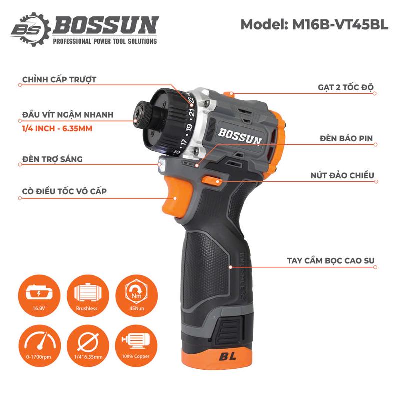 Máy chuyên vít cấp trượt pin BOSSUN 16.8V là một sản phẩm chất lượng cao được thiết kế để đáp ứng nhu cầu sử dụng của các chuyên gia và người thợ trong lĩnh vực xây dựng, cơ khí, điện tử và nhiều lĩnh vực khác. Với lực siết 45n.m, máy có thể thực hiện các công việc vít chặt, khoan, cắt và mài một cách chính xác và hiệu quả.