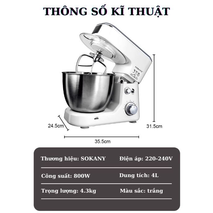 ✨Máy đánh trứng trộn bột để bàn SOKANY SC-209, công suất lớn 800W, cối INOX 4L trộn bột, nhào bột tự động - HÀNG CHÍNH HÃNG