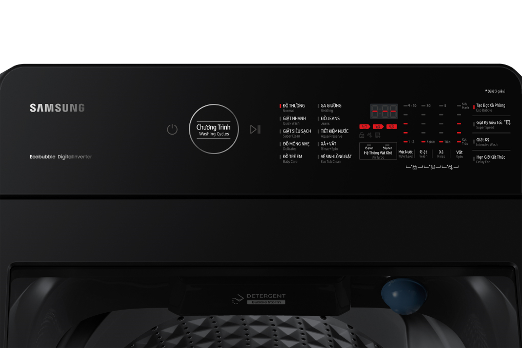 - Thiết lập 10 chương trình giặt như giặt siêu sạch, giặt nhanh, giặt thường, giặt ga giường, tiết kiệm nước, đồ trẻ em, đồ Jeans, vệ sinh lồng giặt, (xem chi tiết tại bảng thông số kỹ thuật). Có chương trình giặt nhanh giúp bạn dễ dàng giặt sạch những trang phục mình cần gấp trong thời gian ngắn mà không cần chờ đợi quá lâu. Hình ảnh chỉ mang tính chất minh họa Công nghệ giặt đặc biệt - Công nghệ giặt bong bóng Eco Bubble: kích hoạt chất giặt tẩy cùng với sự kết hợp giữa khí và nước sẽ tạo thành những bong bóng siêu mịn đi sâu vào sợi vải nhanh chóng, loại bỏ các vết bẩn bám trên quần áo hiệu quả, hạn chế làm hư hỏng, bảo vệ màu, chất liệu tốt hơn. - Bộ lọc xơ vải Magic Filter: giúp lọc sạch lông xơ, bụi bẩn, xơ vải, hạn chế nguy cơ gây tắc đường ống thoát nước, giữ cho trang phục bạn tươm tất, sạch đẹp. - Chế độ giặt Super Speed: cho tốc độ giặt giũ nhanh trong khi không làm ảnh hưởng đến hiệu năng giặt, chăm sóc quần áo và độ bền. - Công nghệ Intensive Wash: máy giặt hỗ trợ công nghệ này có khả năng làm tan bột giặt nhanh chóng để nước thẩm thấu vào vải sâu, giải quyết những vết bẩn cứng đầu dễ dàng. Hình ảnh chỉ mang tính chất minh họa Động cơ - Công nghệ tiết kiệm điện - Samsung WA95CG4545BDSV tích hợp động cơ truyền động trực tiếp, công nghệ Digital Inverter giảm thiểu ma sát khi hoạt động, đảm bảo thiết bị vận hành êm ái, tiết kiệm điện năng đồng thời sử dụng bền bỉ trong suốt quá trình sử dụng.