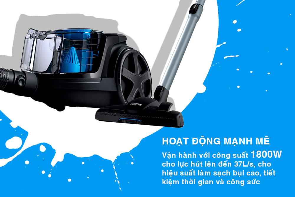 • Tại đầu khoang lốc xoáy, những lưỡi dao ở đường ra loại sạch bụi ra khỏi không khí. Các thông số khác Bán kính hoạt động 9m Chiều dài dây 6m Luồng khí (Tối đa) 37L/s Công suất đầu vào (IEC) 1500W Công suất đầu vào (Tối đa) 1800W Mức công suất âm thanh <82dB Công suất hút (Tối đa) 370W Chân không (Tối đa) 33kPa Dung tích chứa bụi 1.5L