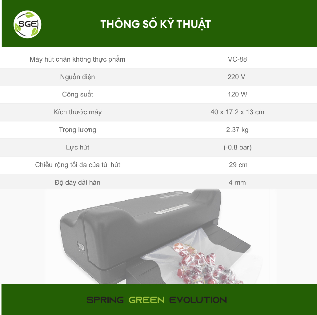 - Khóa nắp từ tính giúp làm việc nhanh hơn. MÁY HÚT CHÂN KHÔNG TỰ ĐỘNG VC88 Máy hút chân không thực phẩm VC88 được thiết kế và phát triển để đáp ứng nhu cầu của các hộ kinh doanh nhỏ, quán ăn, nhà hàng…cần chế biến thực phẩm liên tục trong một thời gian dài với các chức năng đa dạng. Trang bị hộp chứa nước thừa ở phía sau máy, giúp hút chân không các thực phẩm có lẫn (ít) nước mà không lo máy bị hỏng hóc như các dòng máy nhỏ khác. KÍCH THƯỚC THỰC TẾ MÁY HÚT CHÂN KHÔNG VC88 MÁY HÚT CHÂN KHÔNG THỰC PHẨM VC88 CÓ GÌ TỐT? Hỗ trợ hầu hết mọi loại túi, giảm đến 50% chí phí đầu tư Trang bị hệ thông khóa nắp máy Hệ thống nam châm giúp hàn và hút chặt chẽ hơn Chế độ Manual giúp tùy chỉnh thời gian hàn hút chân không Hộp đựng nước thừa trong quá trình hút chân không Dải hàn dày đến 4mm, mối hàn cực kì chắc chắn Lưỡi hút chân không cỡ lớn giúp hút nhanh hơn VC88 GIÚP BẠN TIẾT KIỆM CHI PHÍ TÚI NHƯ NÀO? Bảng so sánh giữa VC88 khi sử dụng với túi hút chân không mặt trơn và máy loại khác khi dùng với túi hút chân không mặt nhám. Có thể nhận thấy “điểm tiết kiệm nhất của việc sử dụng VC88 với túi hút chân không mặt trơn là từ gói thứ 70 trở lên, càng sử dụng nhiều thì chi phí càng giảm”. Tóm lại, nếu sử dụng để kinh doanh hay cho mục đích thương mại với lượng sử dụng từ 7.000 cái trở lên, nên chọn V88 vì sử dụng được với túi hút chân không mặt trơn có giá rẻ hơn nhiều so với túi hút chân không mặt nhám TẠI SAO NÊN CHỌN MÁY HÚT CHÂN KHÔNG SGE?