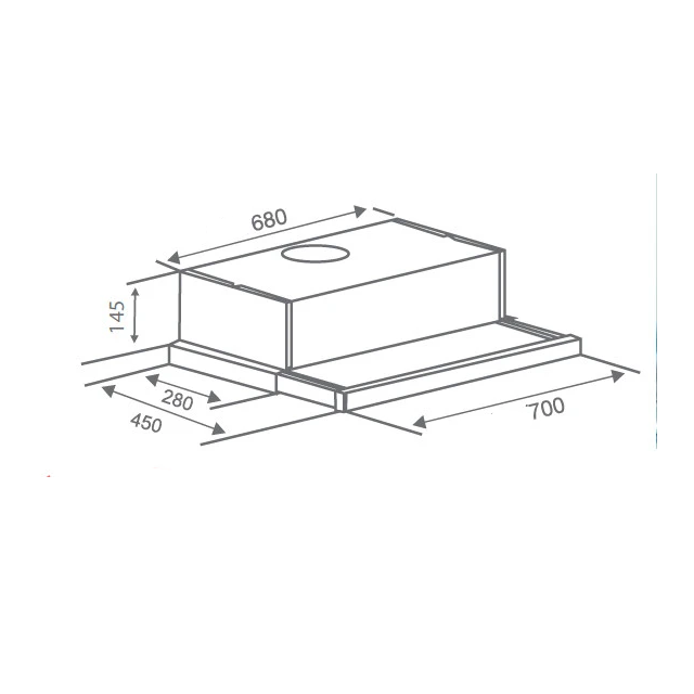 Máy hút mùi âm tủ • Chất liệu kính phối inox sang trọng • Kết cấu âm tủ tiện lợi • Động cơ 1x130W • Đèn Led 2x1.5W • Nguồn điện 220V - 240 V