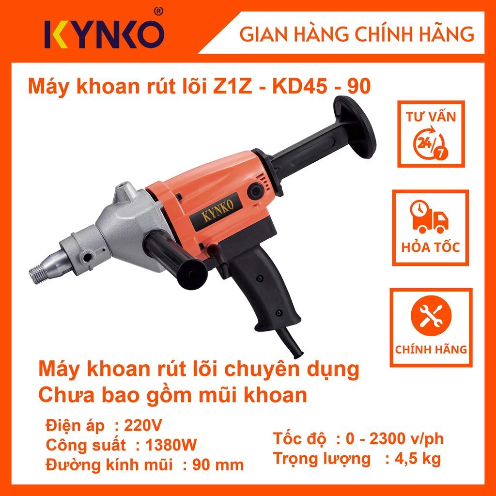 Máy khoan rút lõi bê tông Kynko Z1Z-KD45-90 đang trở nên phổ biến trong lĩnh vực xây dựng, nội thất. Máy khoan bê tông thông thường phải có cơ cấu búa để khoan xuyên qua tường gạch, bê tông. Lỗ khoan của máy khoan búa thường rất nhỏ, muốn tạo lỗ khoan lớn phải khoan nhiều lần không đẹp. Máy khoan rút lõi sử dụng mũi khoan dạng trụ rỗng có gắn răng mài bằng hạt kim cương nhân tạo. Lỗ khoan được tạo ra có dạng tròn đẹp, đường kính tùy thuộc vào mũi khoan.