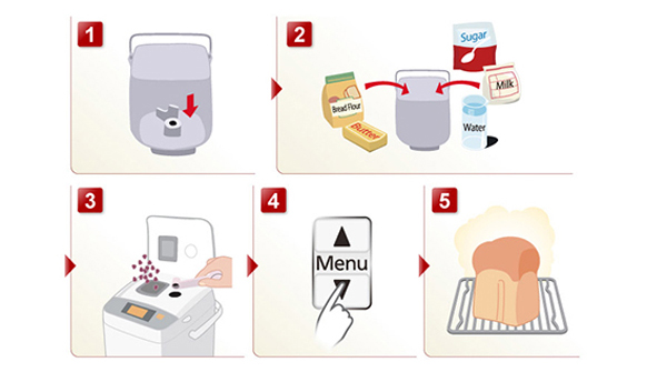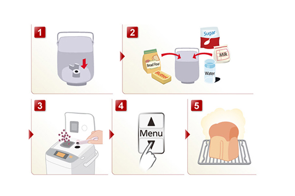 5 bước thao tác và dễ sử dụng Máy làm bánh mì Panasonic PALN-SD-P104WRA với chức năng làm bánh mì hiện đại, đơn giản mang đến sự tiện nghi cho mỗi gia đình. Thay vì phải mua bánh mì sandwich bên ngoài không rõ nguồn gốc nguyên liệu, bạn có thể tự chuẩn bị nguyên liệu và làm bánh mì cho gia đình mà không tốn nhiều thời gian. Máy sử dụng với 5 bước đơn giản và vô cùng dễ dàng: