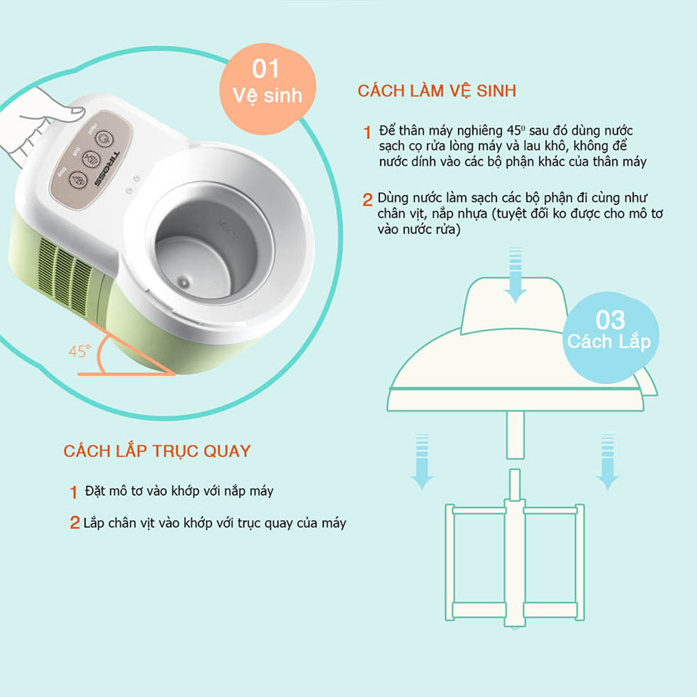 Ứng dụng công nghệ Ba Lan Máy Làm Kem Hoàn Toàn Tự Động Tiross TS9090 (Xanh) có kiểu dáng nhỏ gọn, màu sắc đẹp mắt và sở hữu tính năng hiện đại, giúp bạn tự làm món kem thơm ngon, mát lạnh ngay tại nhà. Sản phẩm được thiết kế và ứng dụng công nghệ hiện đại của Ba Lan, mang lại sự tiện nghi cho mọi gia đình. Tiết kiệm thời gian Sản phẩm ứng dụng công nghệ hướng đến sự tiện nghi cho người dùng với 1 con chip thông minh có tên gọi Chip E-COOL. Chip E-COOL có khả năng làm lạnh siêu tốc, chỉ 90 phút cho một lần làm kem và thời gian giữ lạnh lâu gấp 2 lần máy làm kem thông thường giúp tiết kiệm điện năng cũng như thời gian chế biến. Hoạt động tự động và thông minh Máy Làm Kem Hoàn Toàn Tự Động Tiross TS9090 (Xanh) chính hãng dễ dàng sử dụng chỉ với một thao tác. Bằng 1 nút ấn, máy sẽ tự động làm kem và tự động dừng khi hoàn tất quá trình làm kem rồi chuyển sang chế độ giữ lạnh trong 6 tiếng. Ngoài ra, để máy làm kem theo sở thích cá nhân, bạn có thể chọn chế độ kem cứng hoặc kem mềm. Với cách sử dụng đơn giản, bạn có thể trổ tài khéo léo, chế biến món kem mát lạnh ngày nóng cho cả nhà cùng thưởng thức. Chất liệu an toàn, thiết kế tiện dụng Máy được làm từ chất liệu nhựa tổng hợp và nhôm cao cấp có khả năng chịu lực, an toàn cho sức khỏe tuyệt đối. Ngoài ra, hệ thống làm lạnh tự động nhờ đó động cơ hạn chế sự rò rỉ, an toàn cho quá trình sử dụng. Sản phẩm có thiết kế tiện dụng, nắp bằng nhựa trong suốt có thể quan sát được quá trình làm kem, đồng thời nắp có lỗ cho phép bạn bỏ thêm nguyên liệu cả khi máy đang hoạt động. An toàn cho sức khỏe Sử dụng máy làm kem Tiross bạn không cần sử dụng đến tủ lạnh, nên không lo ngại kem ám mùi thức ăn, thực phẩm tươi sống. Kem tự chế biến tại nhà bằng trái cây không chứa chất phụ gia, chất bảo quản như các loại kem thông thường, tuyệt đối an toàn cho sức khỏe gia đình bạn. Hướng dẫn sử dụng