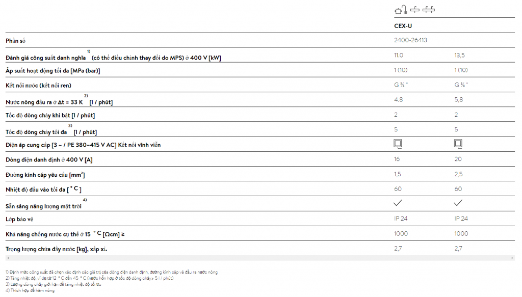 CEX-U với công nghệ điều khiển điện tử đảm bảo an toàn và tiết kiệm năng lượng. Nước nóng sẵn sàng sử dụng ngay sau vài giây kể từ khi mở van nước. Điều khiển và kiểm soát trực quan thông qua màn hình LED cùng các phím bấm cảm ứng và điều khiển từ xa. Tùy chọn nâng cấp với điều khiển qua app trên điện thoại thông minh