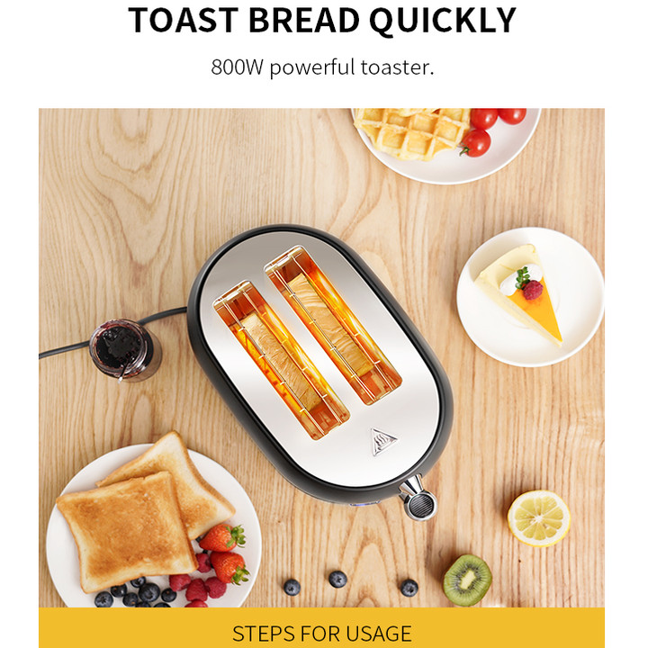 Công suất 900W cùng 8 mức điều chỉnh nhiệt độ nướng khác nhau Chất liệu thép không gỉ và nhựa, an toàn với thực phẩm không chứa BPA cùng 2 khe nướng Định tâm tự