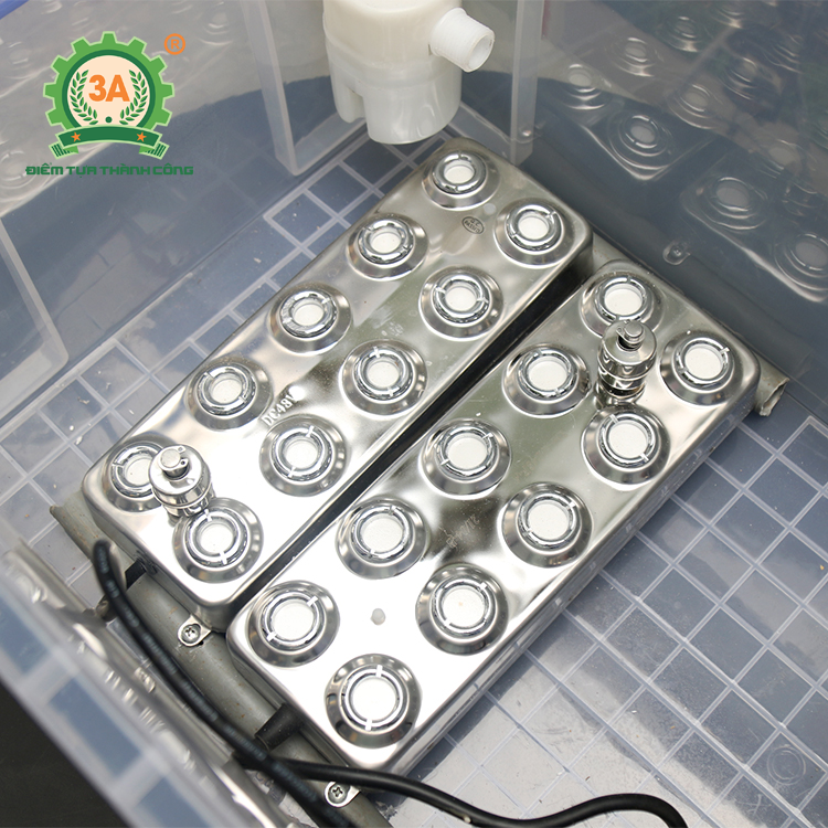 Máy phun sương tạo ẩm trồng đông trùng hạ thảo 3A510W – Bí kíp để nuôi trồng đông trùng hạ thảo đơn giản! Đông trùng hạ thảo là loại dược liệu quý, mang lại giá trị kinh tế cao, hiện được nhiều cơ sở nuôi trồng nhân tạo. Tuy nhiên đây là một kỹ thuật khó, phụ thuộc rất nhiều vào yếu tố ánh sáng, nhiệt độ, độ ẩm môi trường. Để tạo độ ẩm, nhiệt độ phù hợp với khả năng sinh trưởng của đông trùng hạ thảo, Hãng 3A đã nghiên cứu, chế tạo và cho ra đời sản phẩm Máy phun sương tạo ẩm trồng đông trùng hạ thảo 3A510W, giúp cho độ ẩm trong phòng nuôi đông trùng hạ thảo luôn được ổn định. Máy phun sương tạo ẩm trồng đông trùng hạ thảo 3A510W có những ưu điểm nổi bật nào? Máy phun sương tạo ẩm trồng đông trùng hạ thảo 3A510W là một trong những thiết bị đã được đội ngũ kỹ sư tại 3A nghiên cứu và chế tạo với cấu tạo đơn giản nhưng mang lại hiệu quả cao, có nhiều ưu điểm nổi bật: Sử dụng công nghệ tạo sương bằng sóng siêu âm Máy phun sương sử dụng dòng điện để tạo ra sóng siêu âm tách nước thành các hạt nhỏ li ti. Khi nước tiếp xúc với sóng siêu âm sẽ bị phân tách thành hơi nước dạng sương mù, sau đó sẽ được đẩy ra môi trường bên ngoài. Điều này giúp cho độ ẩm nuôi trồng đông trùng hạ thảo luôn được ổn định. Máy hoạt động bằng sóng siêu âm nên hầu như không gây ra tiếng ồn, vận hành êm, hiệu suất cao, tiết kiệm điện năng. Vỉ tạo ẩm siêu âm 20 mắt Máy phun sương tạo ẩm trồng đông trùng hạ thảo 3A510W được trang bị vỉ tạo ẩm siêu âm 20 mắt, giúp chuyển đổi dòng điện xoay chiều có tần số cực cao thành sóng siêu âm rồi phát ra bên ngoài bằng mắt tạo ẩm, công suất vỉ lên tới 250w. Do vậy, máy có thể tạo độ ẩm hiệu quả lên đến 99%. Ngoài ra, máy có khả năng tự bật máy khi ở độ ẩm dưới mức cho phép, tự ngắt máy khi độ ẩm đã đạt mức yêu cầu, nên vỉ sẽ không bị cháy, khuôn vỉ làm từ inox nên chống gỉ, chống nước siêu bền. Năng suất cao 10 lít/h Nhờ sử dụng công nghệ tạo sương bằng sóng siêu âm cho nên Máy phun sương tạo ẩm trồng đông trùng hạ thảo 3A510W có năng suất phun sương khá cao, lên tới 10 lít/h với độ ẩm được phun đều, ổn định. Phao cơ tự động ngắt nước Máy phun sương tạo ẩm được thiết kế phao cơ tự ngắt giúp cấp nước và ngắt nước tự động để duy trì một lượng nước ổn định nhất định bên trong máy tạo ẩm, đảm bảo không xảy ra tình trạng cháy máy hoặc nước quá đầy làm nước tràn ướt sàn. Thể tích thùng chứa lớn Với thiết kế thể tích thùng chứa lên tới 30 lít giúp máy phun sương tạo ẩm chứa được nhiều nước, giảm số lần phải cấp nước khi sử dụng, giúp người dùng tiết kiệm thời gian và công sức. Máy phù hợp sử dụng ở phòng diện tích khoảng 35 - 45m2. Do đó, máy rất phù hợp với các mô hình nuôi đông trùng hạ thảo với quy mô vừa và nhỏ nên được nhiều người lựa chọn. Ngoài ra, thiết bị còn được thiết kế quạt thổi khói nước theo ống nhựa dẫn đi khắp không gian, rất tiện lợi và đảm bảo nước không đọng lại trên sàn. Bộ nguồn 48V bền bỉ với thời gian Nguồn 48V là bộ đổi nguồn xoay chiều thành điện một chiều 48V được sử dụng để chuyển đổi điện áp đầu vào 220V. Bộ nguồn hoạt động ổn định, cho hiệu suất cao, an toàn khi sử dụng. Vỏ nguồn được làm từ nhôm cao cấp, bền bỉ với thời gian. Thiết bị có thêm phần quạt tản nhiệt giúp hoạt động tốt hơn. Bộ nguồn có kích thước nhỏ gọn, dễ dàng lắp đặt. Ứng dụng đa dạng Với tính năng phun sương tạo ẩm, ngoài ứng dụng trong các phòng nuôi trồng đông trùng hạ thảo, Máy phun sương tạo ẩm trồng đông trùng hạ thảo 3A510W còn được sử dụng với nhiều mục đích khác nhau: trang trí phun sương tạo khói ở các nhà hàng, hòn non bộ tiểu cảnh, phun tạo ẩm cho các văn phòng, gia đình, máy phun sương tạo ẩm cho nhà nấm hoặc nhà yến. Cấu tạo của Máy phun sương tạo ẩm trồng đông trùng hạ thảo 3A510W Thông số kỹ thuật của Máy phun sương tạo ẩm trồng đông trùng hạ thảo 3A510W Công suất tiêu thụ 510 (W) Công suất quạt 10 (W) + nguồn Công suất mỗi bộ vỉ tạo sương 250 (W) Bộ nguồn 220V vào – 48V ra (1 chiều) Số lượng quạt 1 (cái) Số mắt trên vỉ tạo sương 20 (mắt) Nguyên liệu đầu vào Nước Sản phẩm đầu ra Dạng khói, hạt sương có độ mịn cao Thể tích thùng chứa nước 30 (lít) Thể tích nước cho mỗi lần cấp 10 (lít) Lưu lượng phun 10 (lít/ giờ) Khoảng cách mực nước so với vỉ phun Cao từ 7 – 10 (cm) Ống cấp nước Phi 10 Phao tự động Phao cơ tự ngắt Loại phao Cơ thông minh Công nghệ ứng dụng Tạo sương bằng sóng siêu âm Diện tích phòng phù hợp 30-45 (m2) Vật liệu chế tạo chính Thùng nhựa, ống PVC Kích thước thùng chứa 515 x 360 x 280 (mm) Kích thước máy 540 x 360 x 320 (mm) Trọng lượng 7 Kg (cả nguồn) Những l