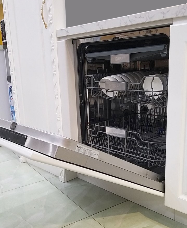MÁY RỬA BÁT ÂM TOÀN PHẦN KAFF KF-BISW12 | 60CM | LẮP ÂM TOÀN PHẦN | 14 BỘ | NHẬP KHẨU NGUYÊN CHIẾC TỪ CHLB ĐỨC ĐẶC ĐIỂM NỔI BẬT MÁY RỬA BÁT ÂM TOÀN PHẦN KAFF KF-BISW12 Tổng quan thiết kế Máy rửa bát Kaff KF-BISW12 có thiết kế hình chữ nhật dọc, có kích thước R598 x S550 x C815 (mm). Nhìn bề ngoài, máy có hình dạng như một chiếc tủ lạnh mini, khá nhỏ gọn và tiện ích, dễ dàng di chuyển tới nhiều vị trí khác nhau trong căn bếp gia đình. Máy rửa bát Kaff KF-BISW12 được thiết kế dạng âm toàn phần nên cần phải đảm bảo diện tích khoang tủ lớn hơn kích thước của máy, để dễ dàng sử dụng và vệ sinh. Phần mặt nạ của máy rửa chén sẽ đồng bộ với tủ bếp nhà bạn Máy rửa bát Kaff KF-BISW12 có nhiều điểm ấn tượng, độc đáo và mới lạ hơn so với nhiều loại máy rửa bát thông thường. Chất liệu của máy là thép không gỉ, bền chắc, toàn thể máy sử dụng tông màu bạc bóng sạch, đẹp tạo cảm giác sang trọng, hiện đại. Mặt trước Mặt trước của máy rửa bát Kaff KF-BISW12 không có phần mặt nạ, bên trong là khoảng trống hở để người dùng dễ dàng nắm được và kéo ra khi cần. Khi mở cánh ra là bảng điều khiển của máy, chứa các phím điều khiển điện tử hiện đại. Nếu người dùng chưa quen với việc sử dụng tiếng anh, khi mua máy rửa bát sẽ đi kèm sách hướng dẫn sử dụng để giới thiệu chi tiết các tính năng của máy. Tên thương hiệu được hiển thị ở góc trái bảng điều khiển máy rửa bát. Mặt đằng sau Mặt đằng sau sẽ toàn bộ khung màu xám, chứa ống thoát nước dài 158cm và ống cấp nước dài 154cm. Ngoài ra còn hệ thống dây điện dài 149cm. Tất cả những vật dụng liên quan đến dây điện, ống dẫn nước được sắp xếp ở mặt sau để tiết kiệm diện tích và đảm bảo tính thẩm mỹ cho máy rửa bát Kaff KF-BISW12. Thiết kế bên trong Máy rửa bát Kaff KF-BISW12 có 3 khay rửa di động hay còn gọi là 3 giàn rửa bát đĩa. Khay trên là khay tiếp xúc gần sát với phần trán lắp trên của máy. Khay trên chủ yếu rửa các loại dao, thìa, dĩa, ké Khay ở giữa có khoang chưa rộng vừa, cho phép rửa các loại bát đĩa, ly, cốc. Các vật dụng rửa có kích thước nhỏ và vừa. Khay dưới cùng của máy có khoang chứa rộng hơn, cho phép rửa các loại nồi nấu, chảo, bát đĩa Ở phía trong bên của máy rửa bát Kaff KF-BISW12 có chứa ngăn chứa muối và ngăn chứa các chất rác trong quá trình rửa. Người dùng cần dùng loại muối chuyên dụng cho máy rửa bát. Mỗi lần đổ muối sẽ dùng được khoảng 1,5 tháng - 2 tháng. Khi hết lượng muối cần thiết, máy sẽ báo hiệu ở trên bảng điều khiển. Bên cạnh đó, phần cánh cửa đậy cần biết về ngăn đựng chất làm bóng và ngăn đựng viên tẩy rửa. Chất làm bóng giúp cho bát đĩa được sáng và bóng hơn, trong khi đó viên tẩy rửa là chất liệu quan trọng để đánh sạch mọi vết bẩn. Các tính năng và chương trình rửa của máy Máy rửa bát Kaff KF-BISW12 có công suất tiêu thụ 1850W, lượng nước tiêu thị là 10 lít/1 lần rửa, cho phép rửa 14 bộ bát đĩa châu âu tương đương với 2-3 bữa ăn Việt (gia đình 6-8 thành viên). Máy có 6 chương trình rửa cơ bản: Rửa kỹ, rửa tiết kiệm, rửa 1h, rửa nhanh, rửa sơ bộ, rửa chờ lên đến 24h Chức năng đặc biệt bổ sung: