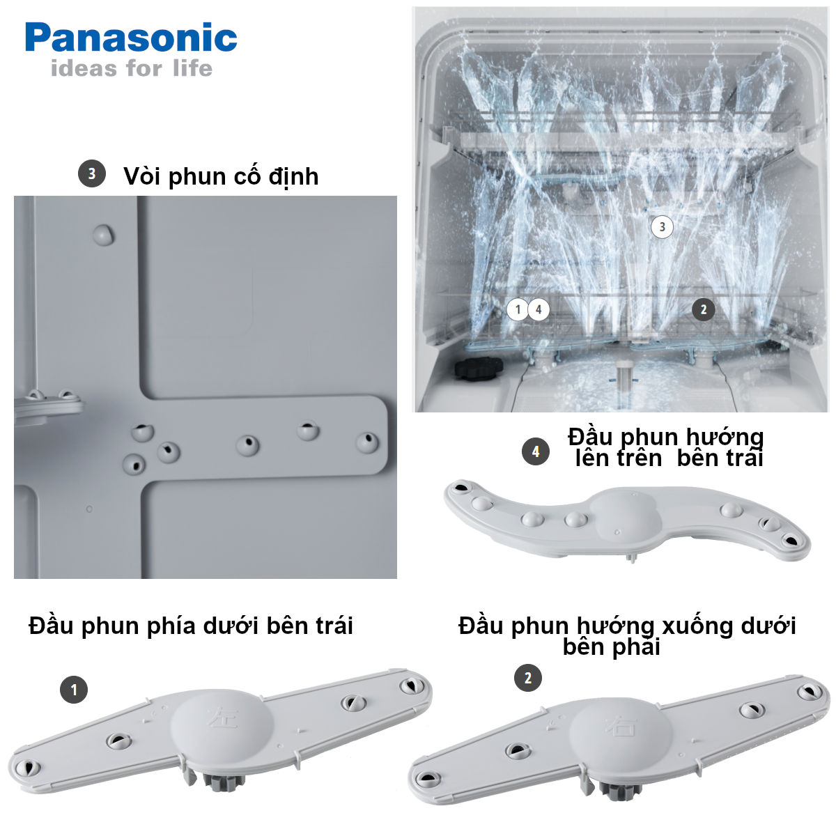 - Đầu phun hướng lên trên bên trái: Làm sạch tối ưu cả bát sâu, ví dụ như bát cơm, bát tô