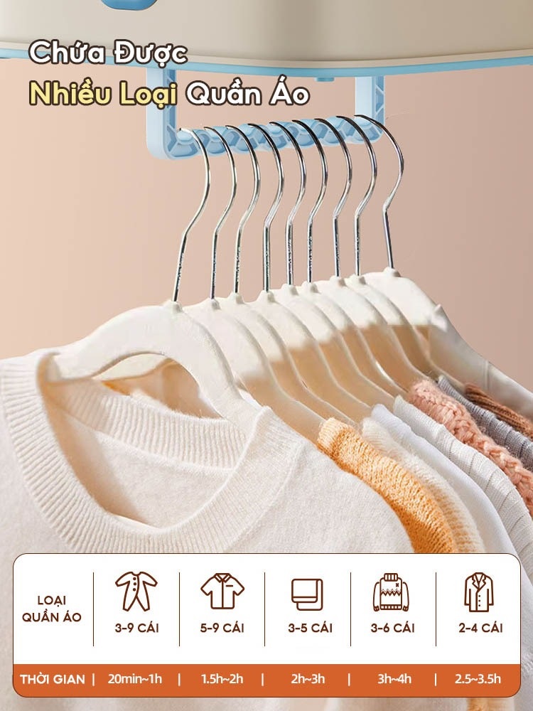 ĐẶC ĐIỂM NỔI BẬT: - Công dụng: làm khô nhanh quần áo, loại bỏ mùi hôi khó chịu, bụi bẩn trên quần áo. - Sử dụng bộ phát điện ổn định PTC, tiết kiệm điện. -