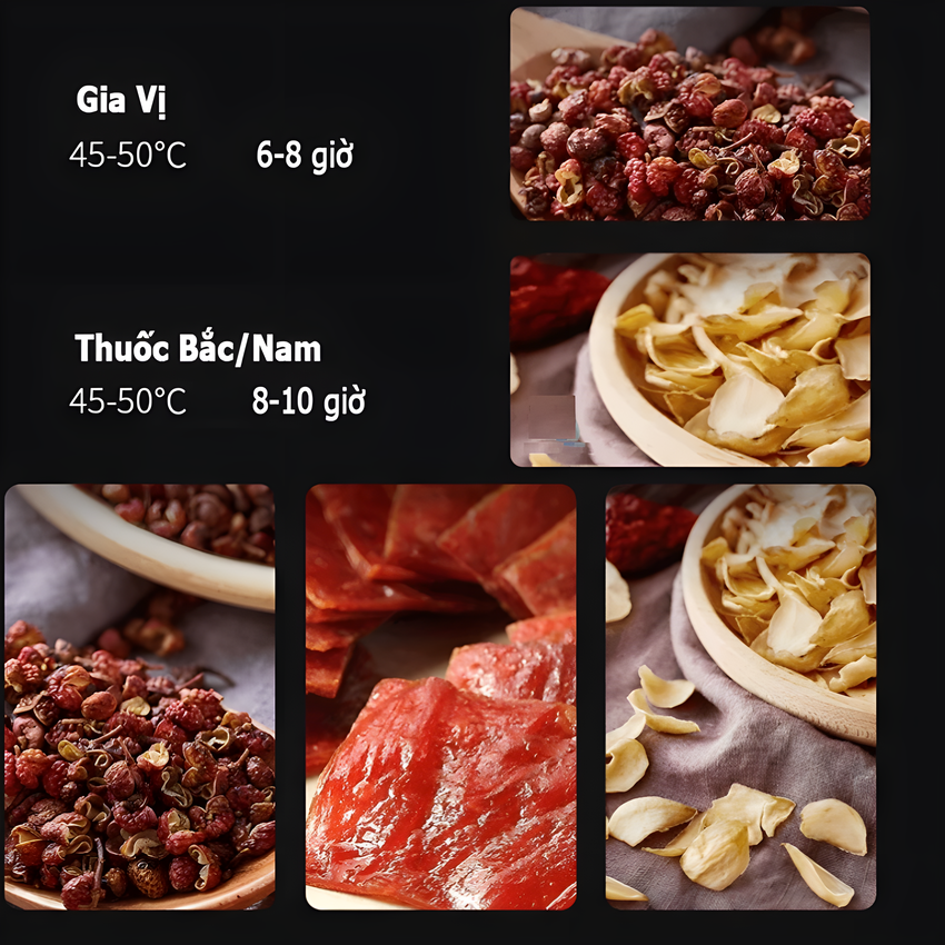 - Sấy thịt cá với biên độ nhiệt từ 70- 90°C: là trợ thủ đắc lực khi bạn bạn làm các món khô gà, khô bò, khô heo, khô nai, khô mực, khô cá..vv