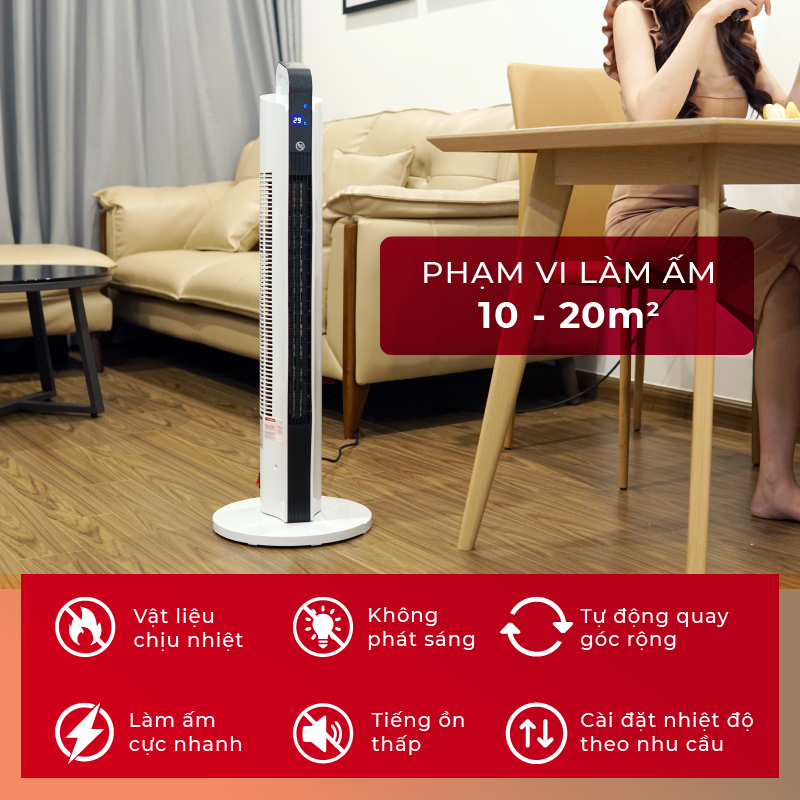 • Quạt sưởi sử dụng sưởi gốm PTC ( Ceraminc ) làm nóng an toàn. Có thể sử dụng ở nhiều nơi khác nhau kể cả trong các phòng ngủ ,đọc sách, thư viện.... sưởi tắm cho e bé... – Tiết kiệm 50% điện năng so với các loại quạt và máy sưởi khác. – Chế độ tự động quay hai bên với góc quay rộng, phân bổ nhiệt đều ra căn phòng. – Có các chế độ gió : Mát / ấm / nóng để lựa chọn rất tiện – Màn hình LCD hiển thị nhiệt độ, giúp bạn dễ dàng theo dõi và điều chỉnh nhiệt độ phù hợp