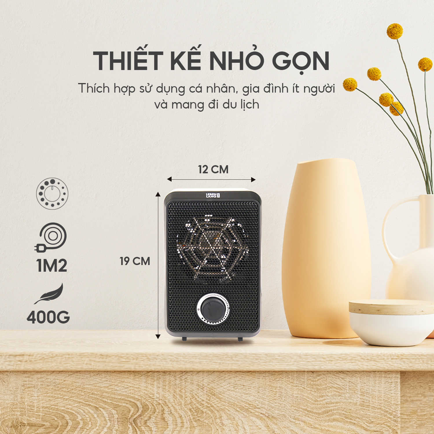 Thiết kế nhỏ gọn, tiện dụng Sưởi ấm nhanh, không gây tiếng ồn 3 mức phát nhiệt Có tính năng quay đảo hướng phát nhiệt, phạm vi phát nhiệt rộng Lưới tản nhiệt thiết kế