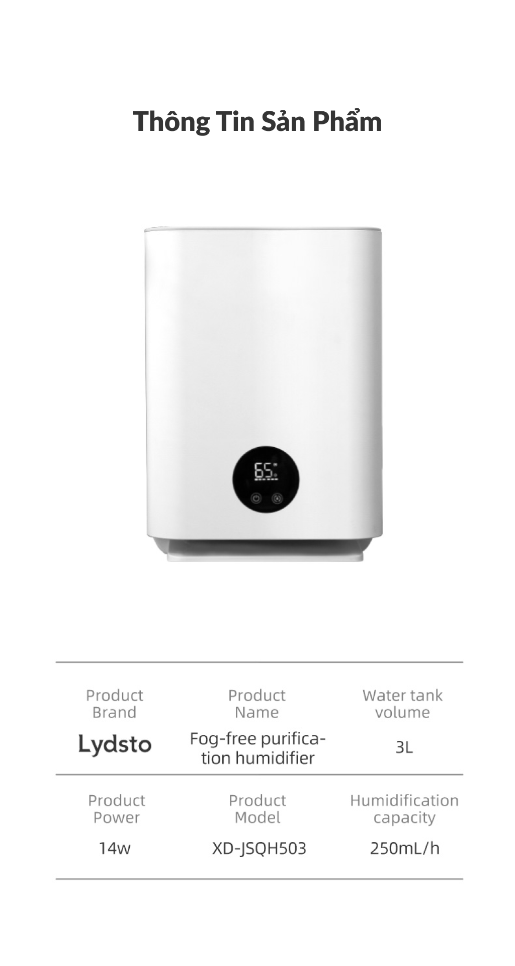 Máy tạo độ ẩm không đọng sương Lydsto H5 Lydsto được ra mắt vào năm 2020 với khẩu hiệu "Start Better With Healthy, Start Healthy With Lydsto". Các công ty trực thuộc Hệ sinh thái Xiaomi chuyên sáng chế và phát triển các sản phẩm chân không - robot chân không. Nhận được hơn 100 bằng sáng chế và chứng chỉ đạt tiêu chuẩn quốc tế. CCC/CE/FCC/KC/PSE/EAC/RCM Các sản phẩm mang thương hiệu Lydsto được chia thành 2 nhóm chính: thiết bị vệ sinh nhà cửa, bao gồm robot hút bụi và máy hút bụi. Phụ kiện ô tô, bao gồm cả máy hút bụi ô tô nhảy pin Máy bơm lốp và hơn thế nữa Thông tin kỹ thuật: "• Mô hình sản phẩm: XD-JSQH503 • Chế độ điều khiển: điều khiển cảm ứng / điều khiển từ xa • Hai tốc độ: 100mL / H, 250mL / H • Dung tích bình chứa nước: 4L • Kích thước sản phẩm: 240 240 337mm • Cài đặt độ ẩm: 50-80% • Chế độ tạo độ ẩm: bay hơi lạnh, tạo độ ẩm tự nhiên • Độ ồn: <32dB • Bay hơi lạnh nano cloud, tạo độ ẩm vòng 3D, hiển thị LED."