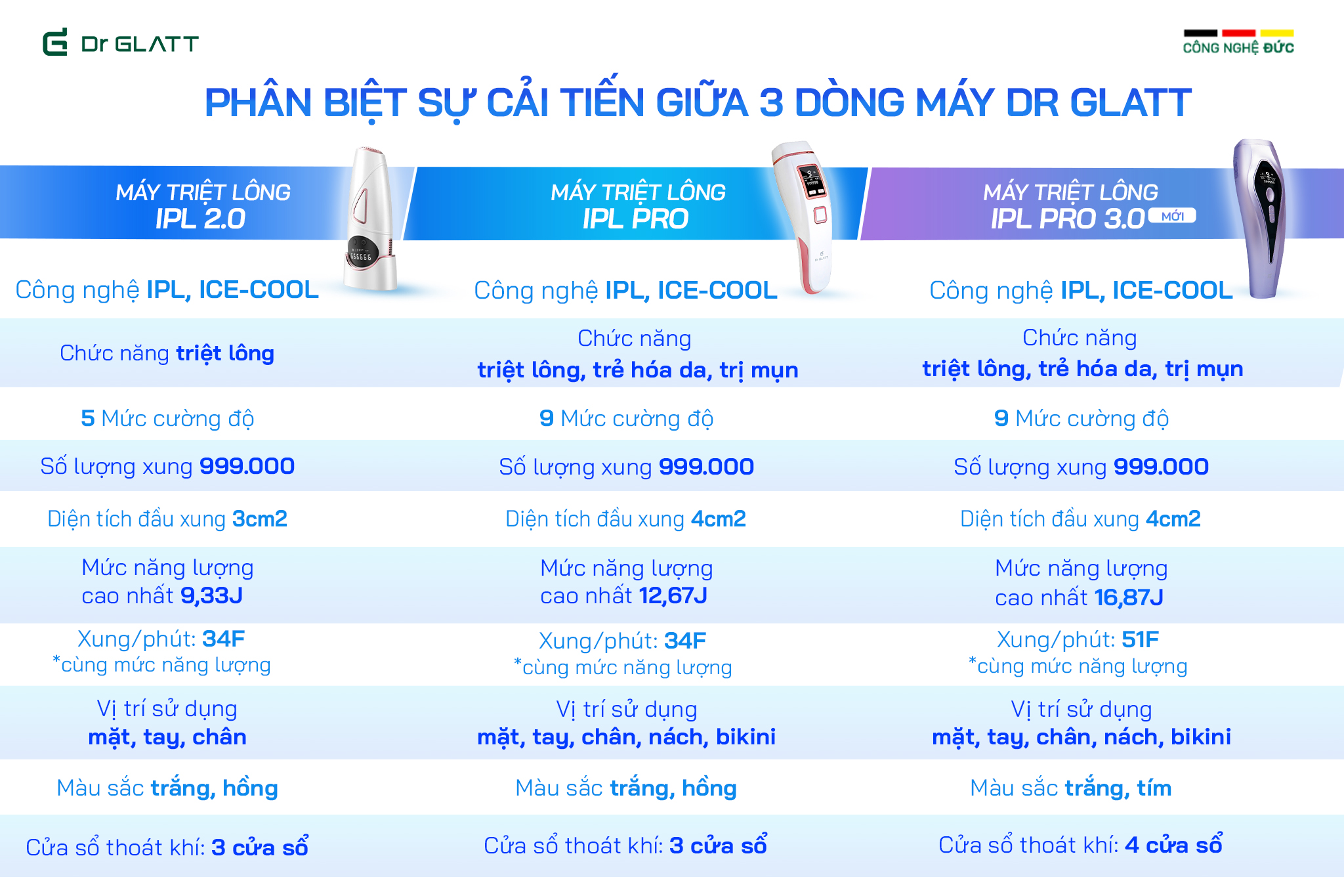 MÁY TRIỆT LÔNG ĐA NĂNG IPL PRO 3.0 DR GLATT HÀNG CHÍNH HÃNG THƯƠNG HIỆU ĐỨC Hơn 80% những ai đã từng dọn lông bằng nhổ, cạo, wax,… nhưng không hiệu quả đều gặp tình trạng lông mọc nhiều hơn và ngứa rát khó chịu. Đó là lý do Dr Glatt cho ra đời  phiên bản máy triệt lông nâng cấp hơn MÁY TRIỆT LÔNG ĐA NĂNG IPL PRO 3.0. Chiếc máy này dành cho những ai chưa từng triệt lông, có dự định triệt lông nhưng ngại dùng chung máy triệt lông khi đến spa, sợ triệt không hiệu quả, mất nhiều tiền. Những ai đã từng triệt lông ở spa và đang muốn triệt duy trì nhưng không có nhiều thời gian và tài chính. ĐỘT PHÁ CÔNG NGHỆ TRIỆT LÔNG – MẠNH HƠN & HIỆU QUẢ HƠN IPL PRO 3.0 – Sở hữu công nghệ triệt lạnh Ice Cool giúp đưa nhiệt độ vùng da xuống 10°C, làm dịu da, không gây nóng, rát hay mẩn đỏ, thích hợp cho mọi vùng da nhạy cảm, đặc biệt là vùng nách & bikini.  Sản phẩm là phiên bản mới nhất với mức cường độ tăng 20%, hỗ trợ triệt lông tối đa, mang lại hiệu quả nhanh chóng hơn. THIẾT KẾ HIỆN ĐẠI THÔNG MINH Máy triệt lông cá nhân với thiết kế nhỏ gọn, tiện lợi, chủ động và tiết kiệm thời gian so với việc triệt lông ở Spa hay phương pháp thông thường. Diện tích đầu chiếu xung 4cm2 với bóng đèn chiếu xung CÔNG NGHỆ ĐỨC Có đến 4 sửa sổ thoát khí làm mát: Giúp máy luôn vận hành êm và ổn định, không bị nóng, phát tiếng ra tiếng khó chịu. Màn hình LCD hiển thị chế độ và số lượng xung bắn còn lại. 2 chế độ triệt: Auto & Manual – Chế độ triệt tự động thông minh giúp thao tác dễ dàng, nhanh chóng. MÁY CHĂM SÓC DA ĐA NĂNG 3 TRONG 1 Siêu phẩm máy triệt lông tại nhà với 3 tính năng trong 1 chiếc máy nhỏ gọn:
