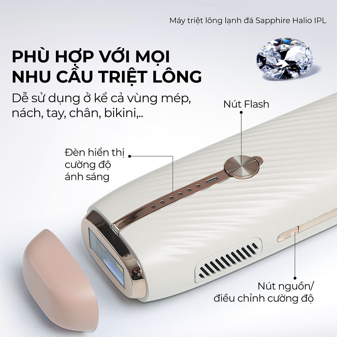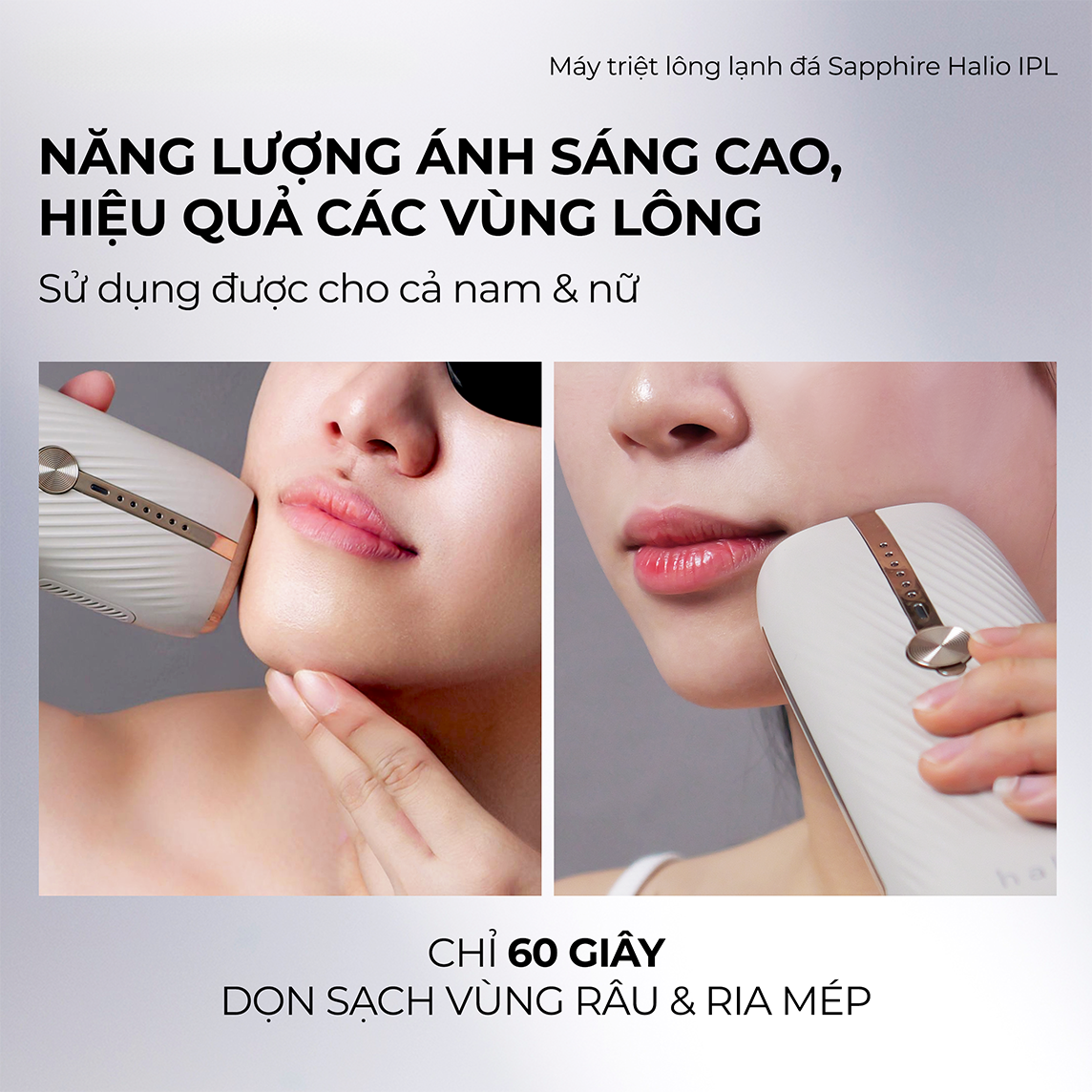 Giới thiệu Máy Triệt Lông Halio InfinityGlow Advanced IPL Sapphire Cooling là người bạn đồng hành lý tưởng, mang đến cho bạn làn da mịn màng và rạng rỡ. Được thiết kế với ba chế độ khác nhau: Chế độ Triệt Trượt cho các vùng da lớn, Chế độ Triệt Điểm cho các vùng da nhỏ, Chế độ Xung kép giúp tăng hiệu quả triệt lông gấp đôi và Chế độ Xung đơn. Công nghệ làm mát Sapphire giữ nhiệt độ thiết bị ở mức 10°C để ngăn ngừa bỏng rát, trong khi tốc độ phát xung siêu nhanh chỉ 0,25 giây giúp rút ngắn thời gian triệt toàn thân chỉ trong 10 phút. Máy Triệt Lông Halio InfinityGlow Advanced IPL Sapphire Cooling cũng được trang bị số lần phát xung không giới hạn, mua một lần sử dụng trọn đời. Thêm vào đó, với ổ cắm đa điện áp, sản phẩm trở nên tiện lợi khi mang theo du lịch. Tận hưởng trải nghiệm triệt lông thoải mái và làn da mịn màng cùng với Máy Triệt Lông Halio InfinityGlow Advanced IPL Sapphire Cooling. Cách sử dụng Bước 1: Kiểm tra màu da và màu lông trước khi triệt lông để đảm bảo bạn phù hợp để sử dụng máy triệt lông lạnh Sapphire của Halio