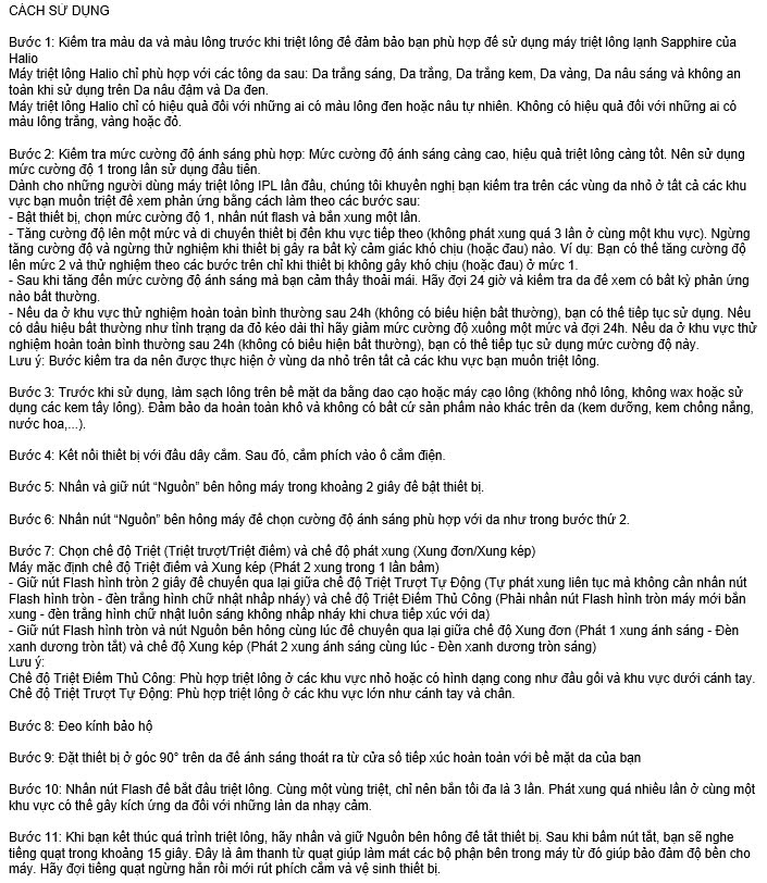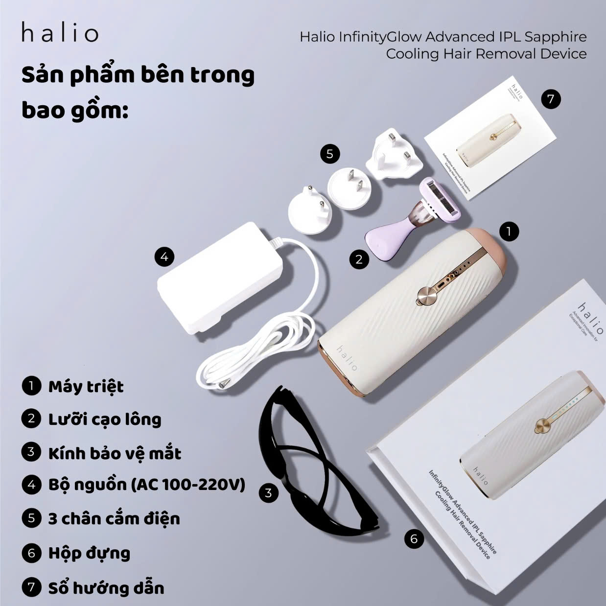 - Để tránh bắn xung quá nhiều trên cùng một vùng da gây bỏng rát, máy tự động ngừng phát xung ánh sáng sau 8s nếu Giữ đầu máy ở cùng một vùng da - Hoặc - Di chuyển máy từ vùng da này sang vùng da khác nhưng không nhấc đầu máy lên (*) Sản phẩm Máy Triệt Lông Halio InfinityGlow Advanced IPL Sapphire Cooling bao gồm:
