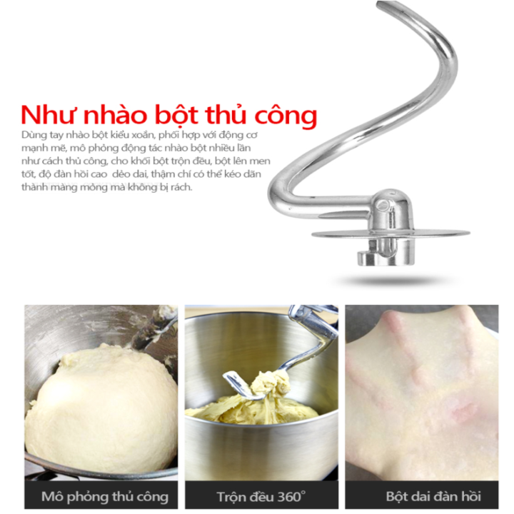 - Chân đế thiết kế đặc biệt có khả năng chống rung và trơn trượt khi máy hoạt động. Thông số kỹ thuật: – Dung tích: 5.0 lít - Tối đa 1kg – Điện áp: 220-240V/50Hz – Công suất: 1000W – Máy có 3 tốc độ đánh khác nhau – Công suất bột tối đa: 50% nước – Kích thước máy: 320 x 315 mm – Trọng lượng: 5.4 kg – Bảo hành: 12 tháng – Máy có 3 bộ đánh bằng inox dùng để đánh trứng, bột kem, bột mì, trộn thực phẩm Hướng dẫn sử dụng - Trước khi lắp thiết bị, đảm bảo đã rút dây nguồn khỏi ô điện, đồng thời nút tốc độ vặn về số 0.. 1. Ấn nút “tilt” tạo độ nghiêng cho đầu thiết bị, đầu thiết bị sẽ tự động nhả ra, và cố định tại vị trí nghiêng. 2. Chọn que đánh mong muốn tùy theo kết cấu bột bạn định thực hiện: que trộn dẹt dùng để trộn và đánh trứng, bơ, que hình móc trộn bột bánh mỳ, phới đánh trứng lồng dùng để đánh bông lòng trắng trứng/sữa chất lỏng. 3. Lắp que trộn bẹt/que hình móc/ phới đánh trứng trực tiếp cho tới khi khớp vào đúng vị trí. Lưu ý: Đảm bảo que trộn bẹt, que hình móc, phới đánh trứng phải được lắp hoàn toàn, nếu không kết quả trộn sẽ bị ảnh hưởng. 4. Đặt âu trộn vào đúng vị trí. Đặt âu lên đế, sau đó quay âu theo chiều kim đồng hồ, cho đến khi âu được khóa vào đúng vị trí 5. Dùng tay hạ đầu thiết bị, que trộn bẹt/que hình móc/ phới đánh trứng xuống âu. Bạn sẽ nghe thấy tiếng click khi lắp vào đúng vị trí. - Đảm bảo rằng nút vặn tốc độ ở chế độ Tắt, sau đó cắm dây nguồn vào ổ điện.. - Xoay nút tốc độ đến nấc mong muốn. Chú ý: Không đặt dao, thìa kim loại, nĩa vào âu, khi thiết bị đang hoạt động. TỐC ĐỘ SỬ DỤNG Que hình móc : 1. Tỷ lệ tối đa của khối bột: 1000g bột: 600 ml nước(35-45℃) 2. Tỷ lệ phù hợp nhất là 700g bột: 420ml nước(35-45℃)