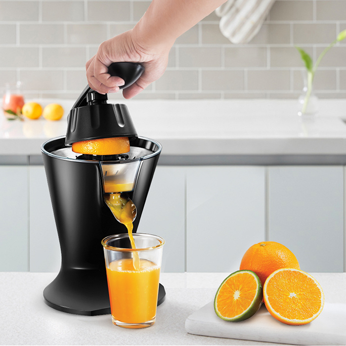 - Nhờ có cần gạt đòn bẩy với tay cầm mềm, việc vận hành máy vắt cam trở nên đặc biệt dễ dàng, không sợ đau tay.