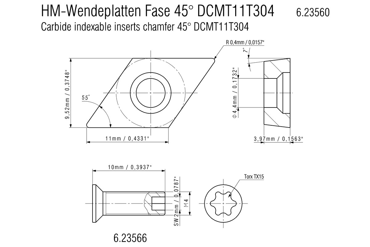 2x ống lót Cacbit có thể phân chỉ số mép vát 45 độ (ISO: DCMT 11 T 304)