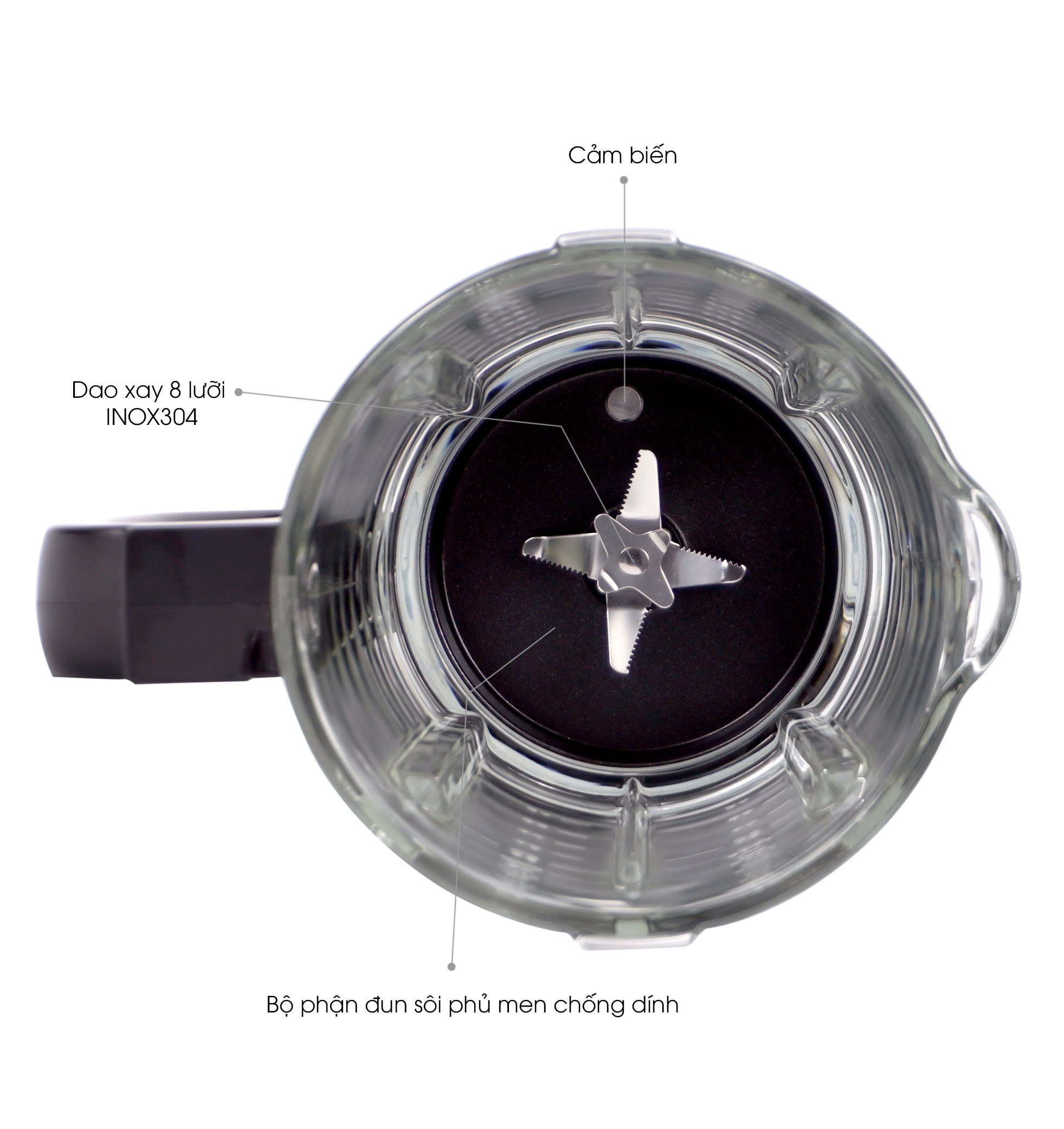 Cấu tạo cối thủy tinh,dao xay 8 lưỡi inox 304 sắc bén, ít bị mài mòn, bền bỉ theo thời gian, bộ phận đun sôi phủ men chống dính dễ dàng vệ sinh. Bộ nhông truyền lực bằng kim loại.