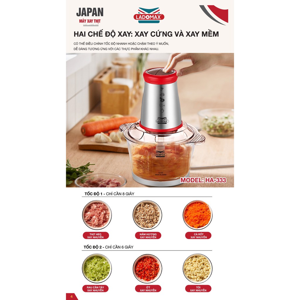 Thông tin sản phẩm - Tên sản phẩm: MÁY XAY THỊT ĐA NĂNG - Thương hiệu: LADOMAX - Model: HA-333 - Điện áp: 220V - 50Hz - Dung tích: 2L - Công suất: 400W -