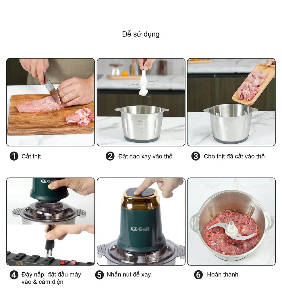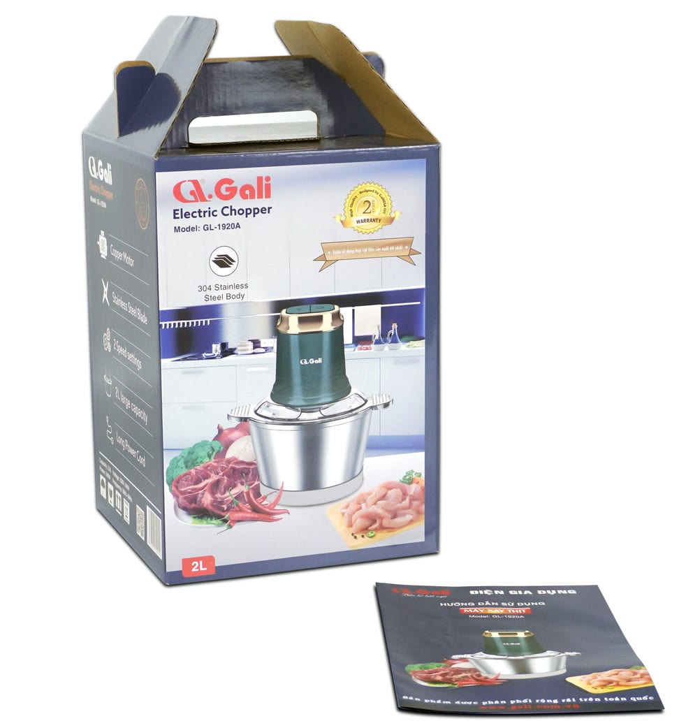 Máy xay thịt Gali GL-1920A 2 lít đa năng được sử dụng để xay nhuyễn các loại thực phẩm như thịt, cá, rau củ quả để làm các món ăn như xúc xích, pate, thịt băm, hay các món canh, nấu súp.  Các tính năng chính của máy xay thịt bao gồm: Thân máy bằng nhựa hoặc chứa Motor 100% dây đồng có trang bị cầu chì tự ngắt điện khi gặp sự cố quá tải và quá nhiệt.     Lưỡi dao xay bằng hợp kim, có cấu tạo 4 lưỡi, sắc bén giúp xay nhuyễn mọi nguyên liệu Công suất 500W và 2 tốc độ xay đa năng: Tốc độ xay cũng có thể điều chỉnh để phù hợp với từng loại thực phẩm.     An toàn và dễ vệ sinh: Thân, cối xay và lưỡi dao dễ dàng tháo lắp, thuận tiện cho việc vệ sinh sau mỗi lần sử dụng.     Đa năng: Ngoài xay thịt, một số loại máy còn có thể xay nhuyễn các nguyên liệu khác hay các loại rau củ khác để làm các món ăn khác nhau.     Máy xay thịt Gali GL-1920A 2 lít là một công cụ hữu ích trong bếp nấu ăn, giúp cho việc chế biến thực phẩm trở nên nhanh chóng và thuận tiện hơn.  Đặc điểm nổi bật máy xay thịt Gali GL-1920A 2 lít