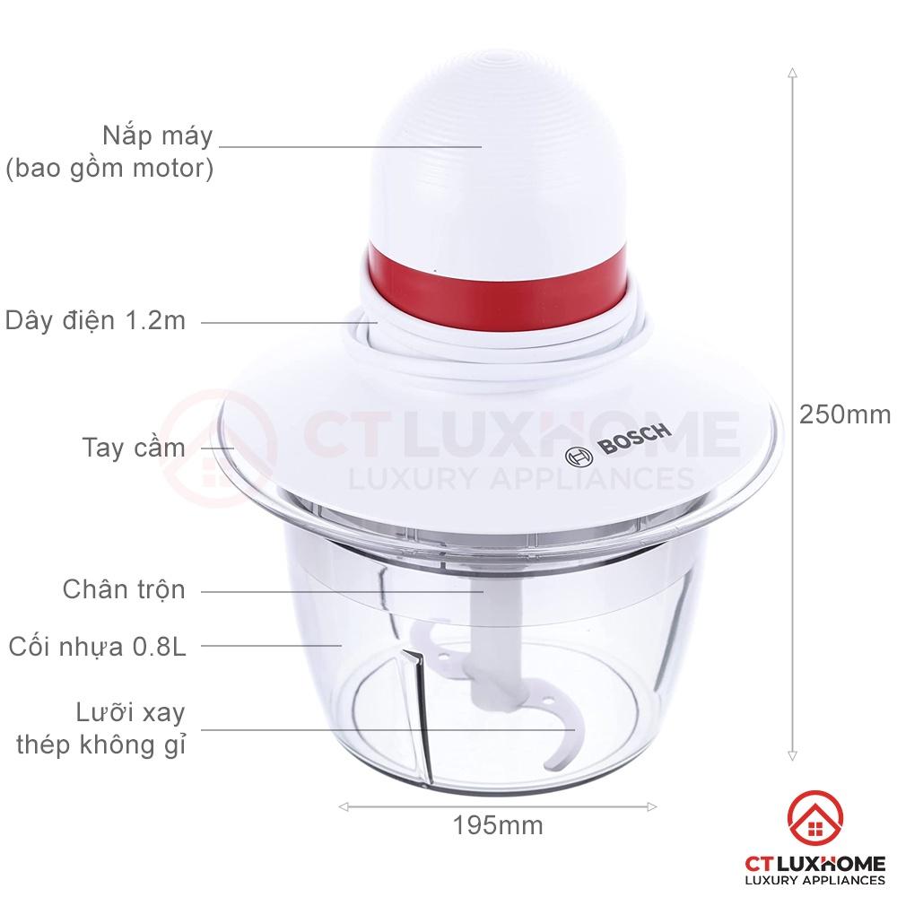 Thương hiệu Bosch Model MMR15A1 Sản xuất tại Slovenia Loại máy xay Máy xay thịt Chức năng - Xay thịt - Xay gia vị - Xay rau củ - Xay đá lạnh - Đánh bông