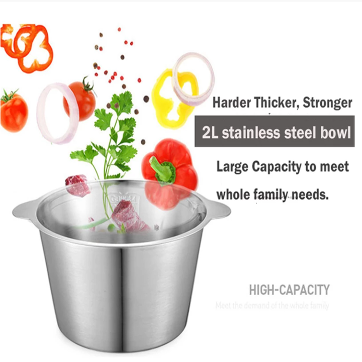 - Tốc độ II: Lưỡi dao quay nhanh thích hợp xay các thực phẩm cứng: Thịt, hạt cứng, cà rố Chất liệu cao cấp - Cối xay sử dụng inox 304 100% không làm biến đổi dinh dưỡng của thực phẩm, an toàn cho sức khỏe. Dung tích 2L, dễ dàng tháo lắp và lau chùi sau khi sử dụng