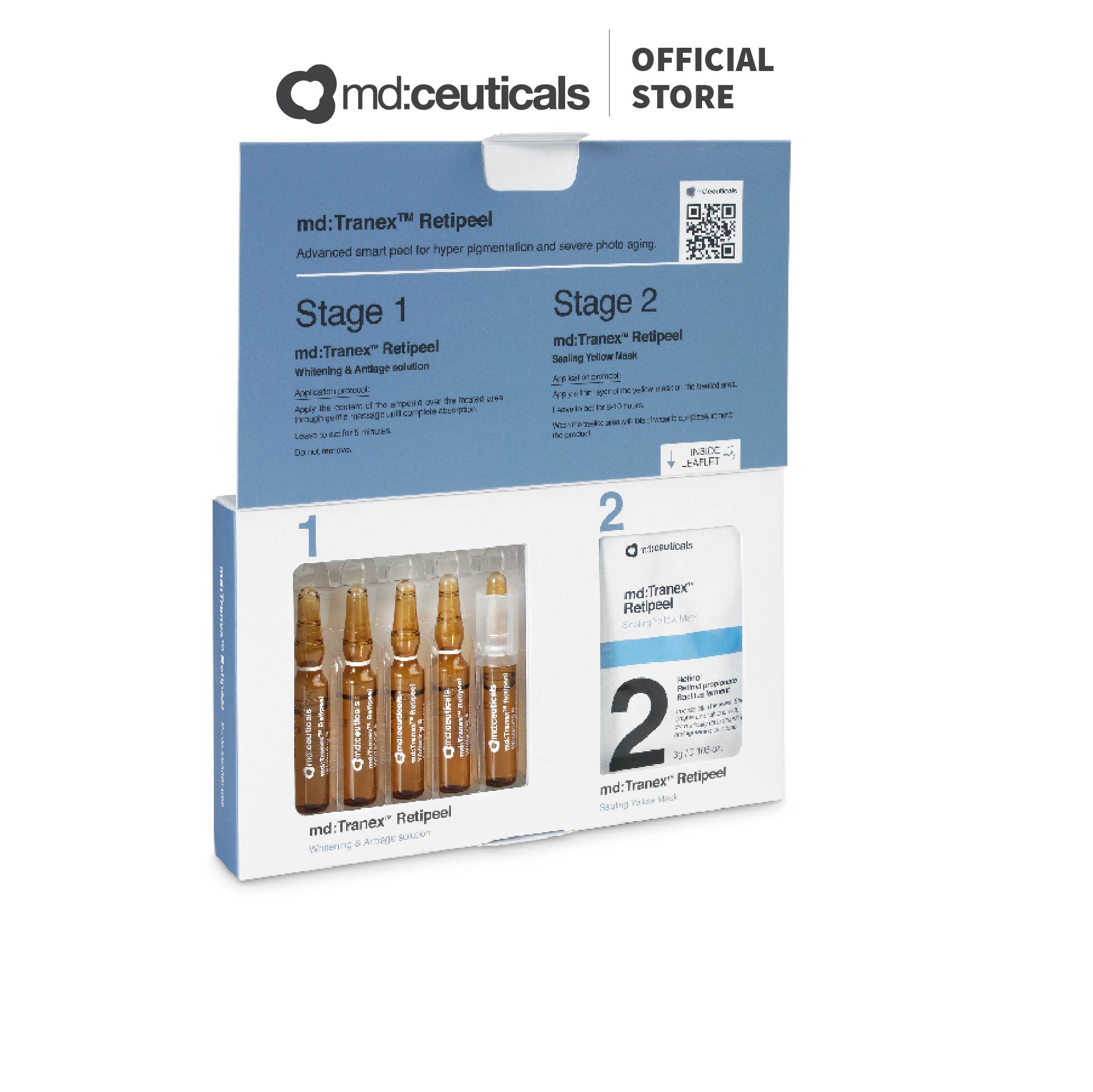 md:Tranex Retipeel cung cấp một công thức độc đáo kết hợp axit Tranexamic và Retinol với các nguyên tắc hoạt động chống sắc tố và giảm sắc tố mạnh mẽ nhất (Retinyl propionat + Ascorbyl Glucoside + Niacinamide + Axit citric + Axit Tartaric + Chiết xuất hoa Chamomilla recutita + Thảo mộc Willow + Bacillus Ferment) để loại bỏ tất cả các loại tăng sắc tố melanic và điều trị hiệu quả tình trạng lão hóa ảnh nghiêm trọng, sẹo mụn và vết rạn da.